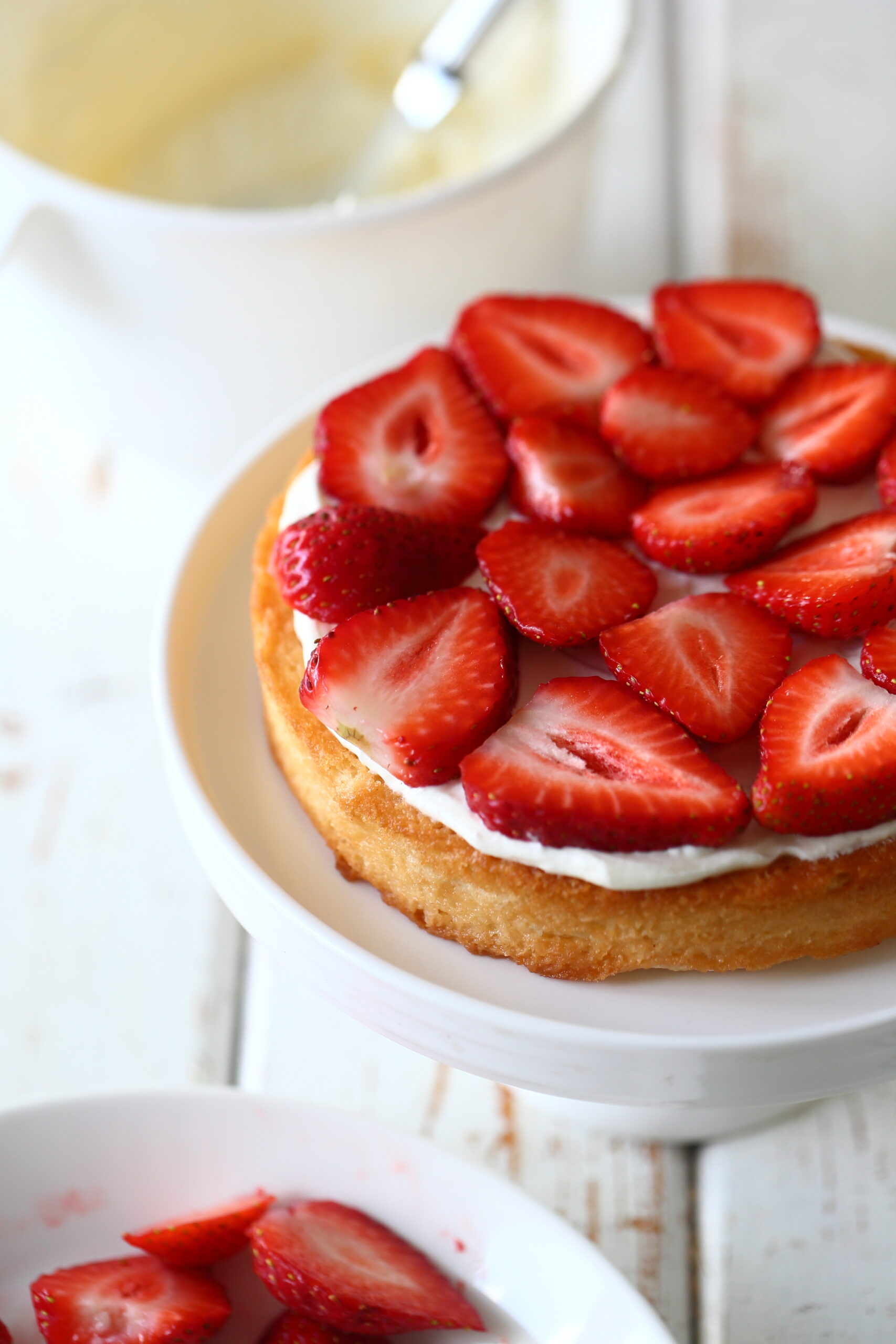 Mutta mutta. Vaikka pohja toimikin ihan hyvin, loppupeleissä en ole aivan varma, maksaako vaivan tehdä kakkupohja tällä tavalla vai kannattaako suosiolla pitäytyä aiemmassa, aineet-vain-sekaisin -tyyppisessä taikinassa. Tämän pohjan tekeminen vie enemmän aikaa kuin sekoitettavat taikinat, eikä koostumus silti yllä täysin sokerikakkupohjan tasolle. Lopputulos ei siis suinkaan ollut huono, vaan kakku maistui kokonaisuudessaan tosi hyvälle. Ihanalle mansikkakakulle.