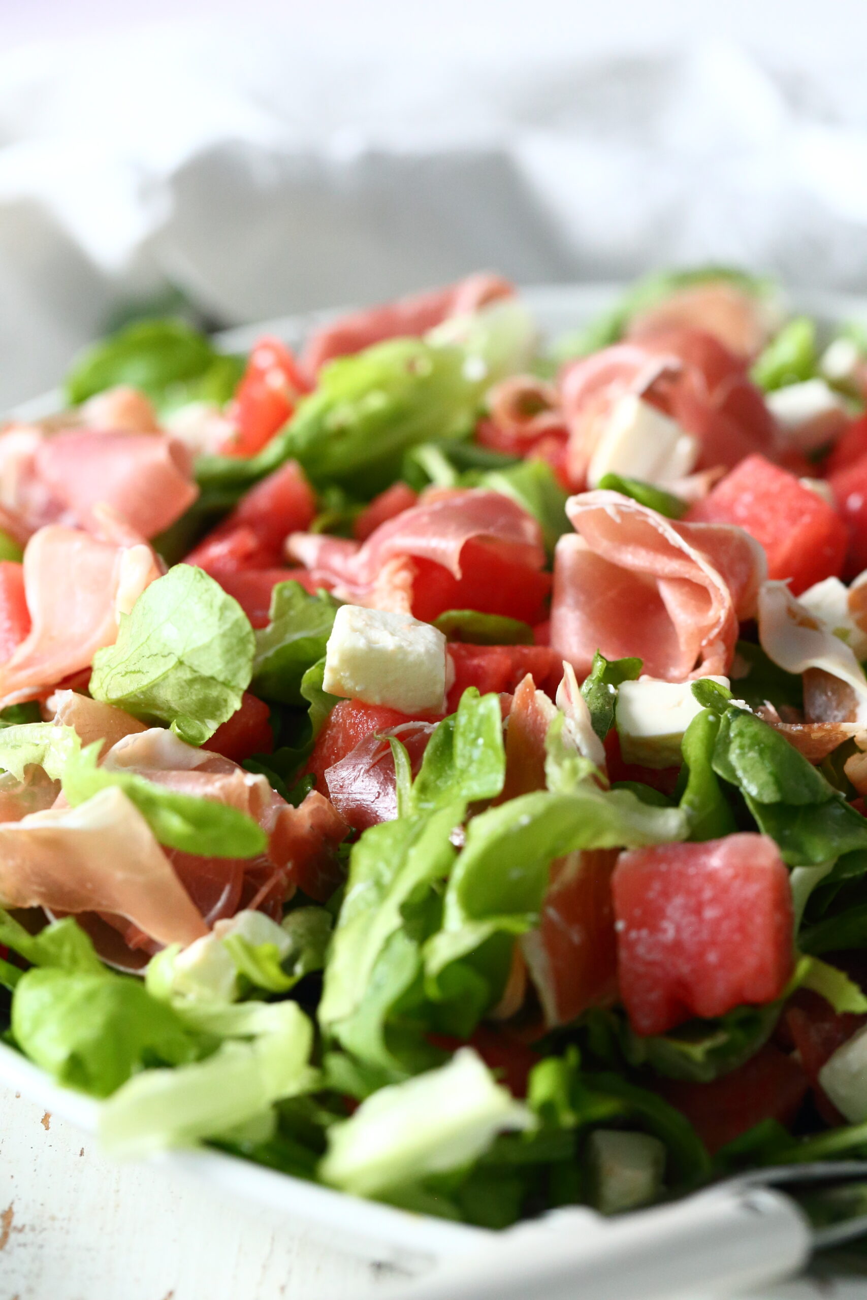Kuori ja kuutioi vesimeloni. Kuutioi myös juustopala (tai käytä valmiita paloja). Pese ja valuta salaatit. Laita kaikki aineet parmankinkkua lukuunottamatta tarjoilulautaselle ja sekoita kevyesti. Nosta päälle parmankinkut. Ja eikun nauttimaan!