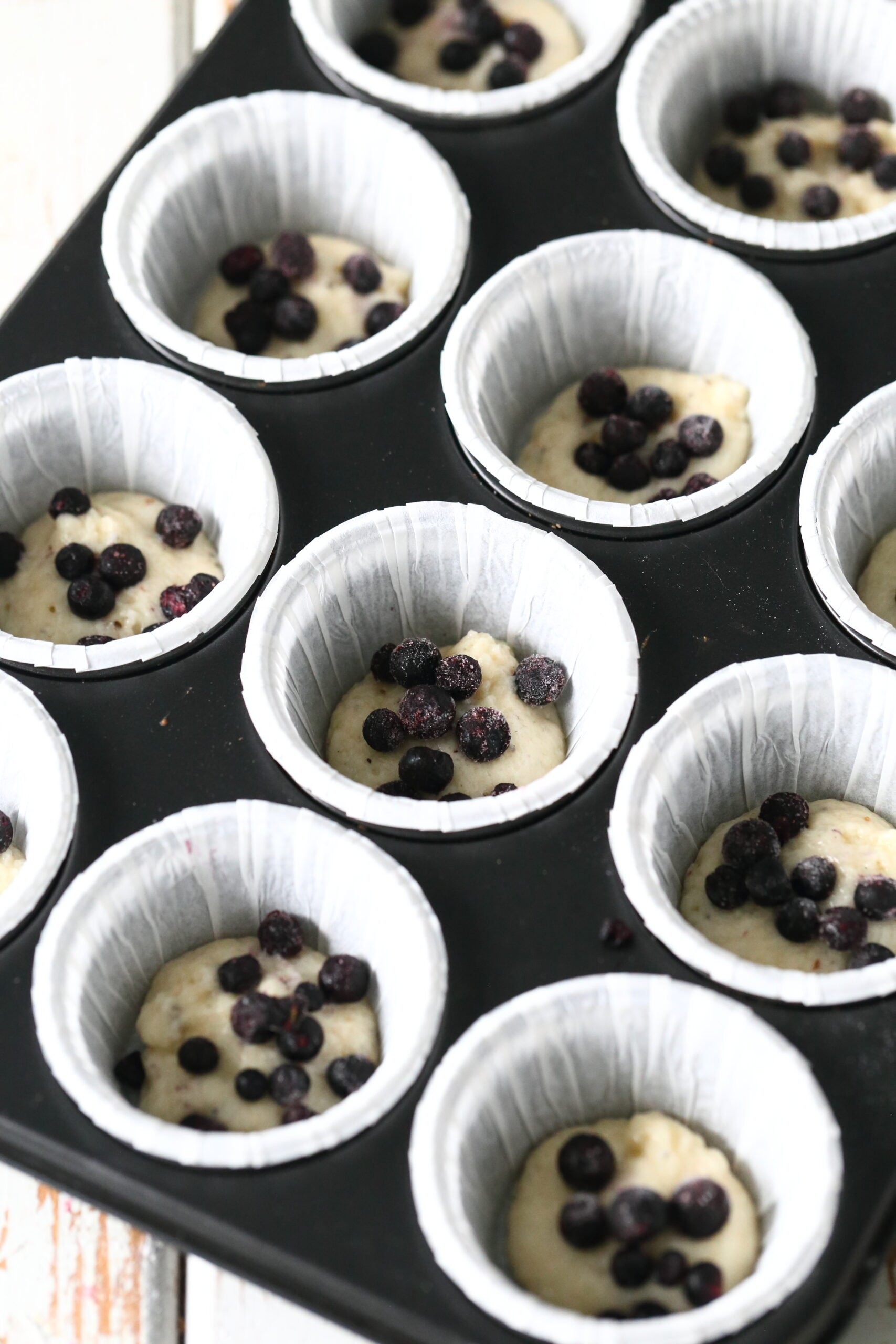 Taikina on melko jäykkää, ja mustikat voivat helposti värjätä taikinan. Jos pelkäät mustikoiden värjäävän taikinan, älä lisää mustikoita suoraan taikinaan, vaan lisää vuokiin taikinaa ja mustikoita vuorotellen. Laita ensin hieman taikinaa muffinssivuokaan, ripottele pinnalle mustikoita, lisää hieman taikinaa ja ripottele lisää mustikoita ja päälle vielä hieman taikinaa. Tähän tyyliin: