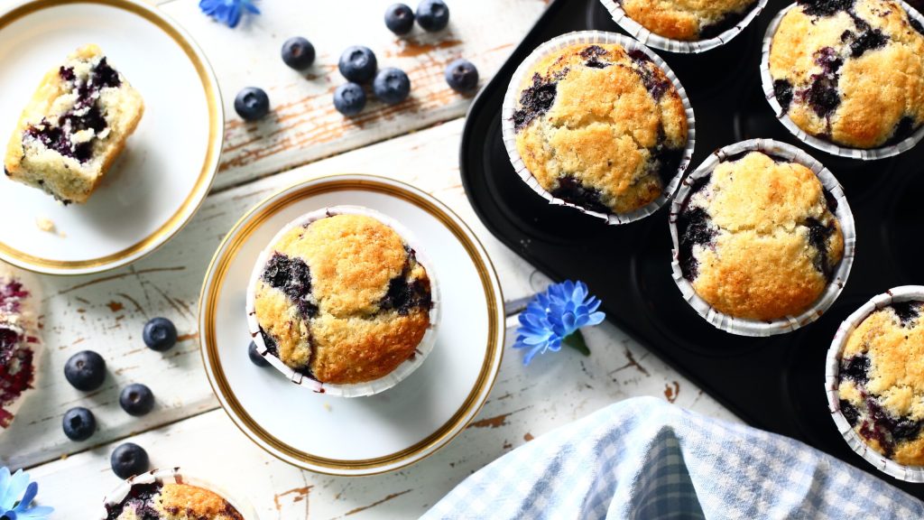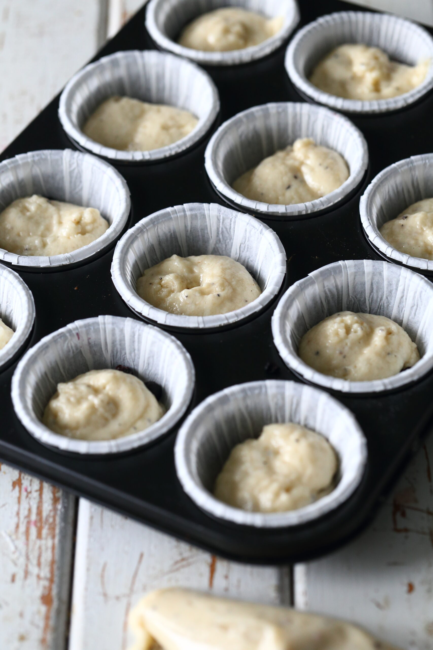 * Muffinit onnistuvat sekä tuoreista että pakastetuista mustikoista. Taikina on sen verran paksua, että myös tuoreet mustikat voi olla hyvä lisätä vuokiin kerroksittain taikinan kanssa.