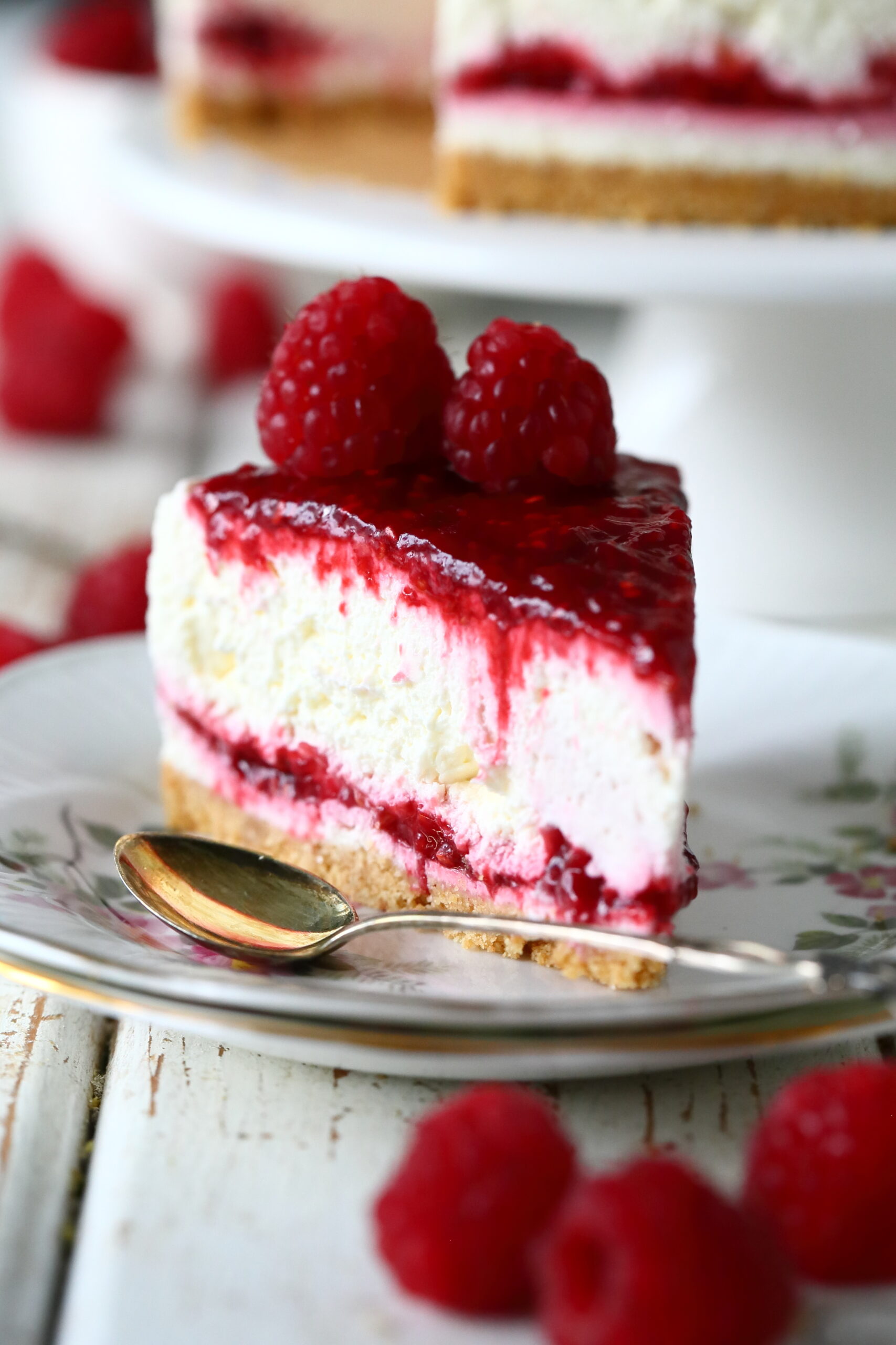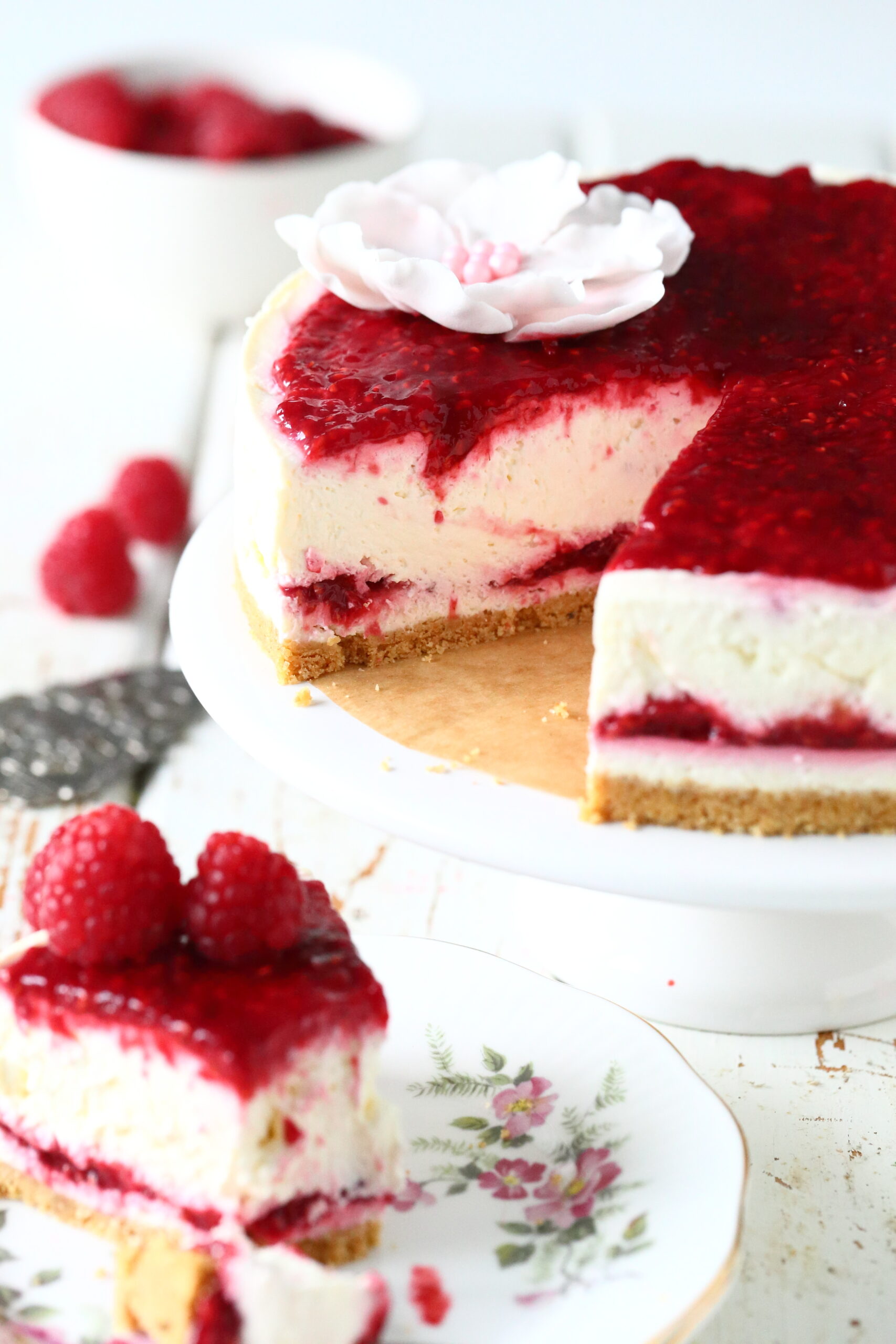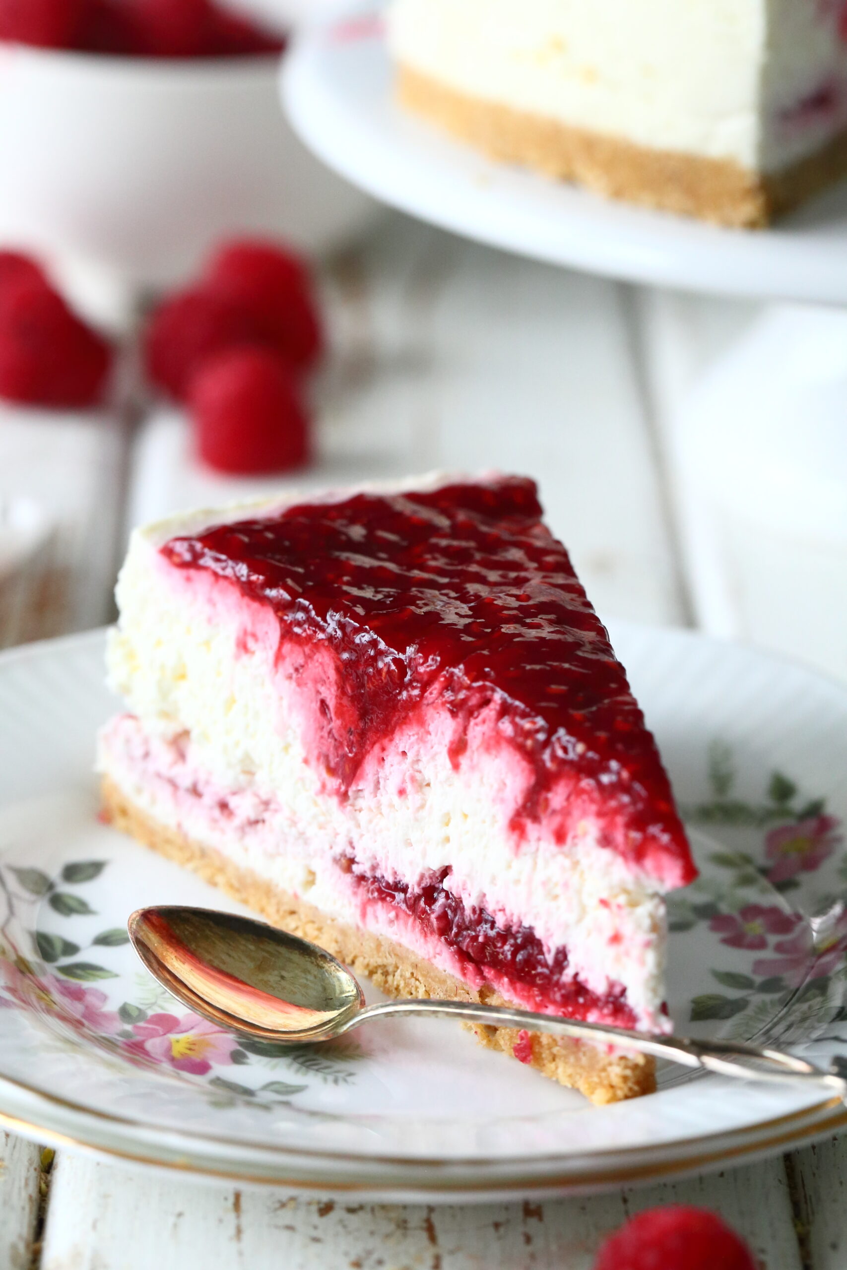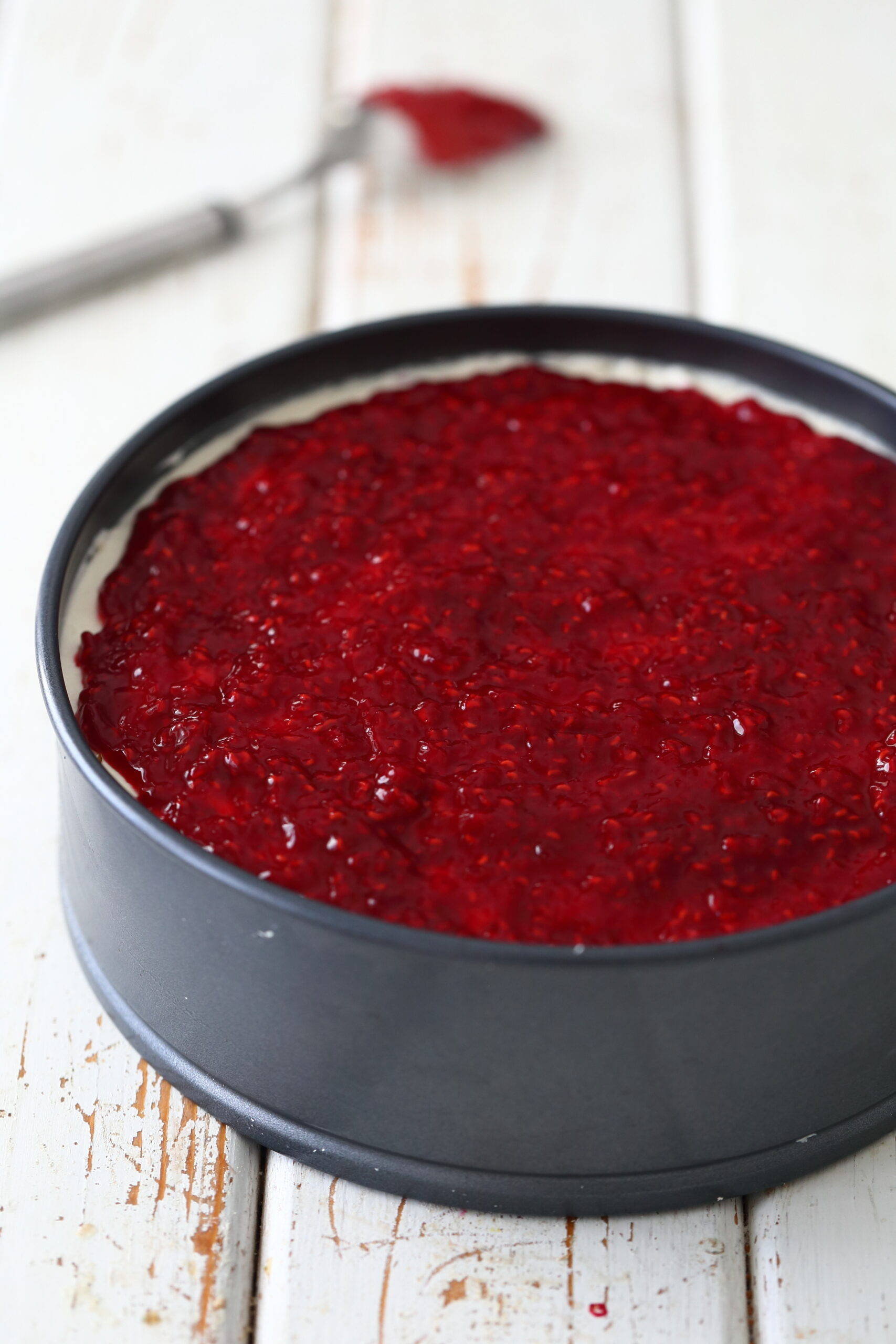 Ohjeen täyte on hyvin pitkälti sama, kuin älyttömän hyvässä mustaherukkaisessa juustokakussakin. Pehmeään juustokakkukerrokseen tulee vain kourallinen aineita; vispikermaa, tuorejuustoja ja valkosuklaata. Valkosuklaa sekä jähmettää että makeuttaa moussea, eikä sen lisäksi täytteeseen tule muuta lisättyä sokeria. Kahdesta kerroksesta löytyvä vadelmakastike tuo kakkuun lisämakeutta ja makua.