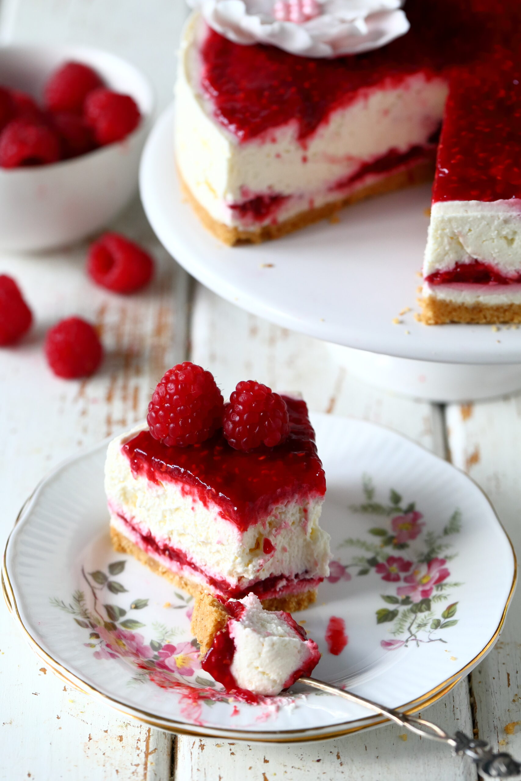 Kakku, jossa on rapea keksipohja, liivatteeton miedosti valkosuklainen juustokakkukerros sekä vadelmakastiketta kahdessa kerroksessa. Juustokakkuhammastani alkoi kolottaa sen verran, että halusin leipoa tällaisen kakun ihan vain sen takia. Ja hyvää tuli.