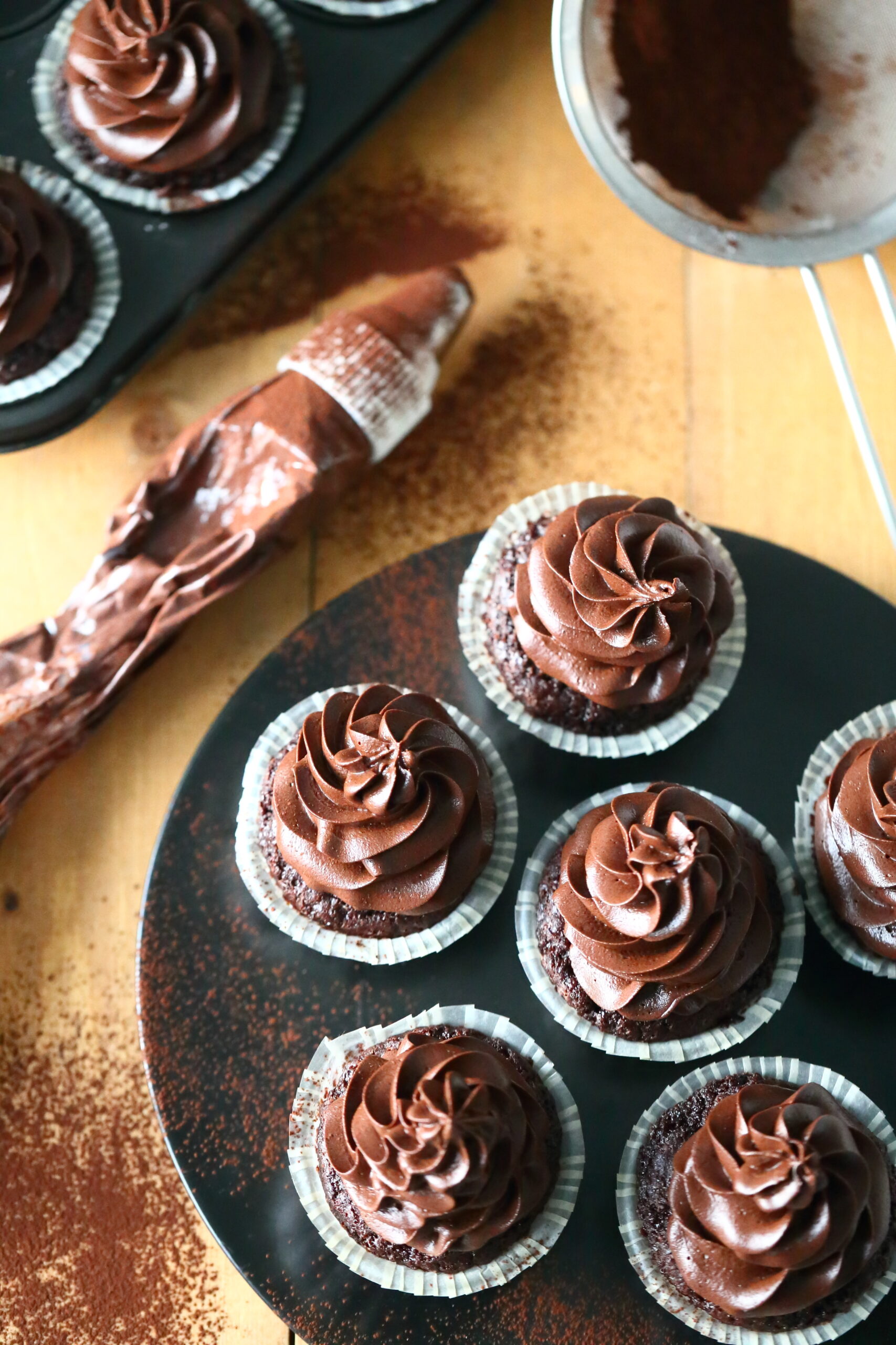 Tämän kuorrutteen suklaisuus tulee suklaan sijasta kaakaojauheesta. Koska kaakaojauhe antaa kuorrutteelle ja muffinsseille the maun, kannattaa muffinsseissa käyttää hyvää kaakaojauhetta. Tätä maistellessani mietin, että voisin seuraavaksi kokeilla sellaista versiota, jossa olisi sekä suklaata että kaakaojauhetta. Mutta siis tosi hyväähän tämä oli näinkin, pelkällä kaakaojauheella tehtynä.
