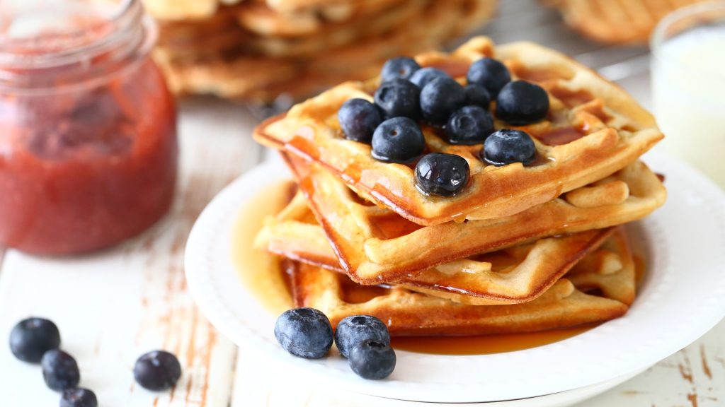 Vohvelit kannattaa nauttia vielä lämpiminä. Kylkeen sopii esimerkiksi vaahterasiirappi ja marjat.