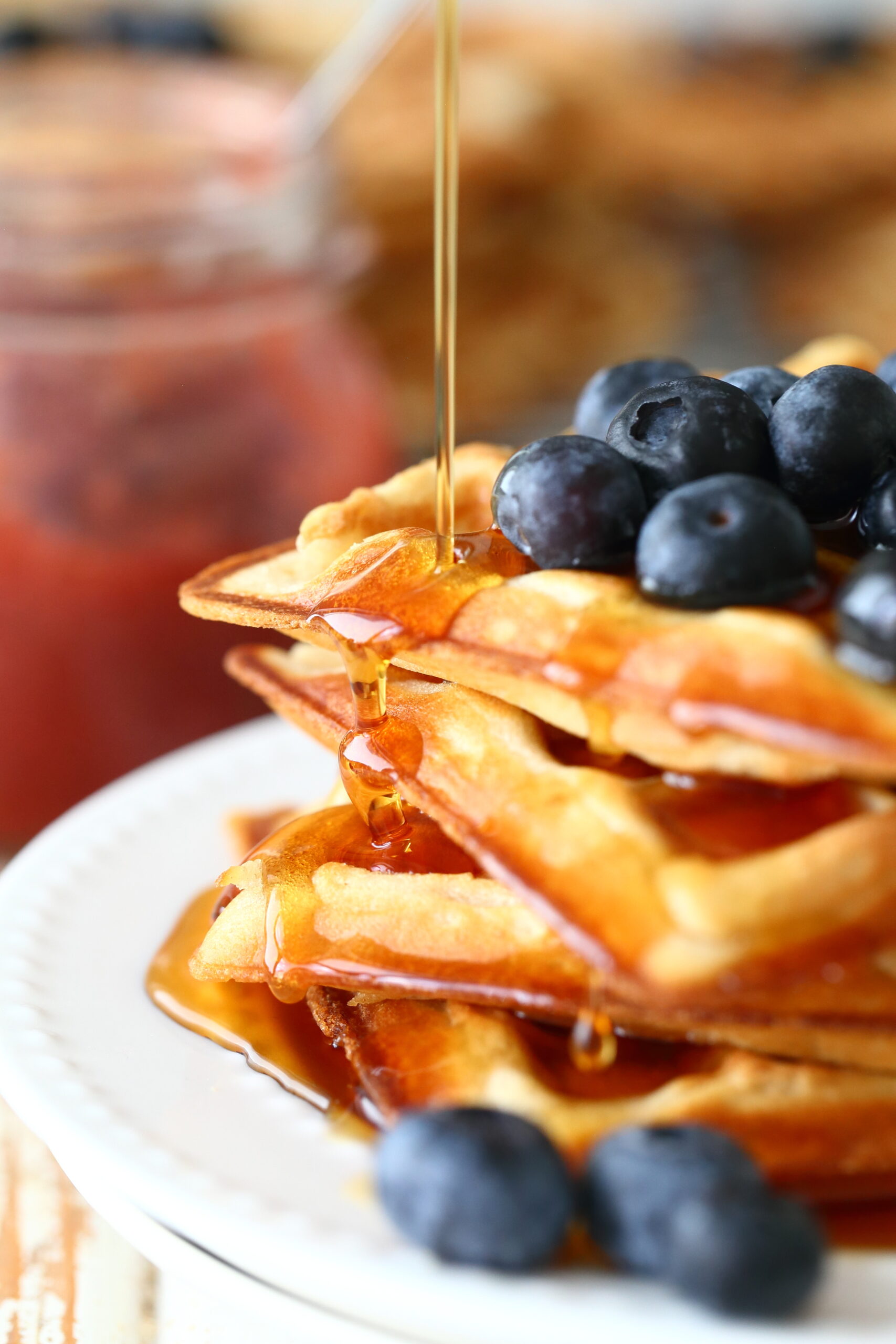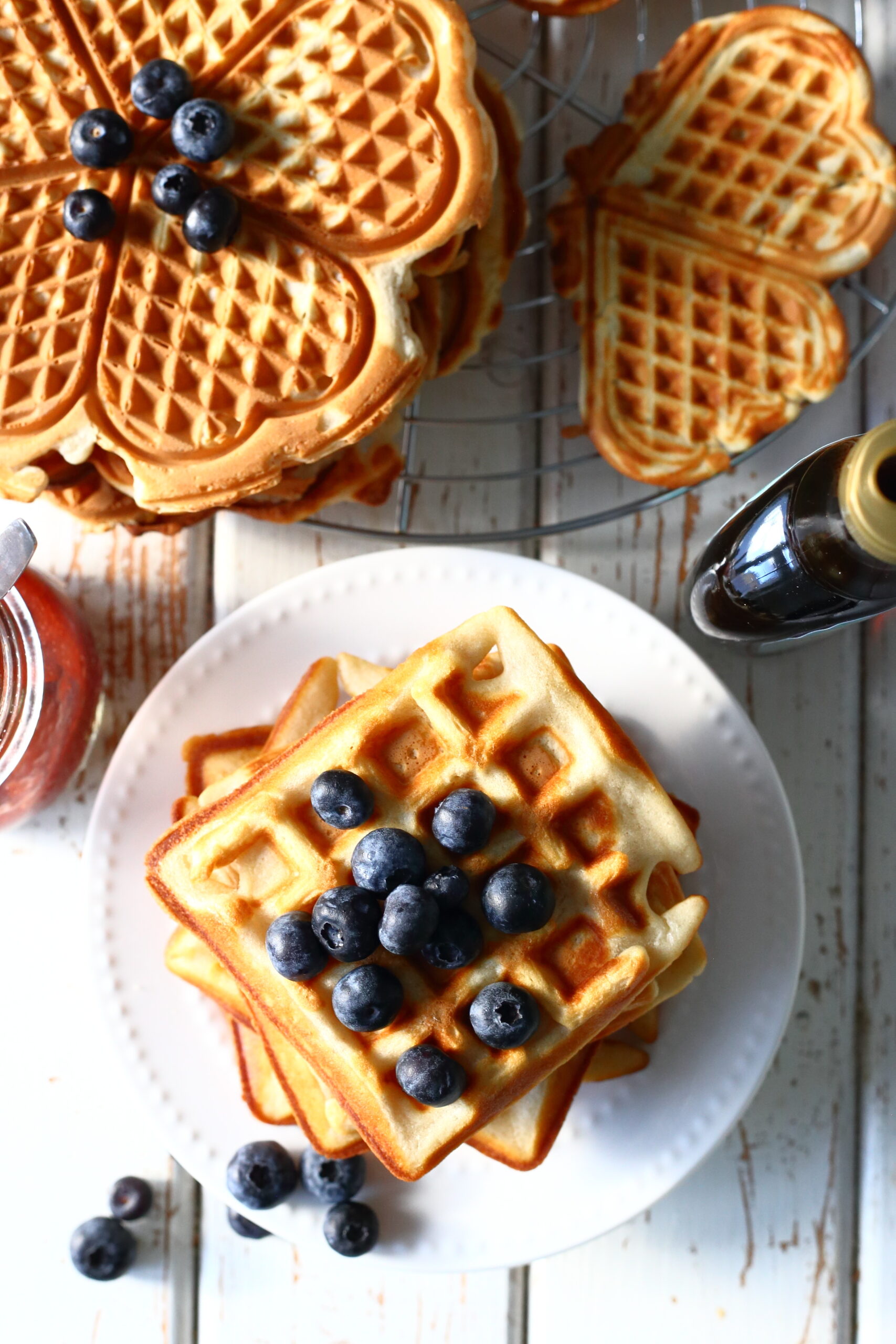 Vohvelit kannattaa nauttia vielä lämpiminä. Kylkeen sopii esimerkiksi vaahterasiirappi ja marjat.