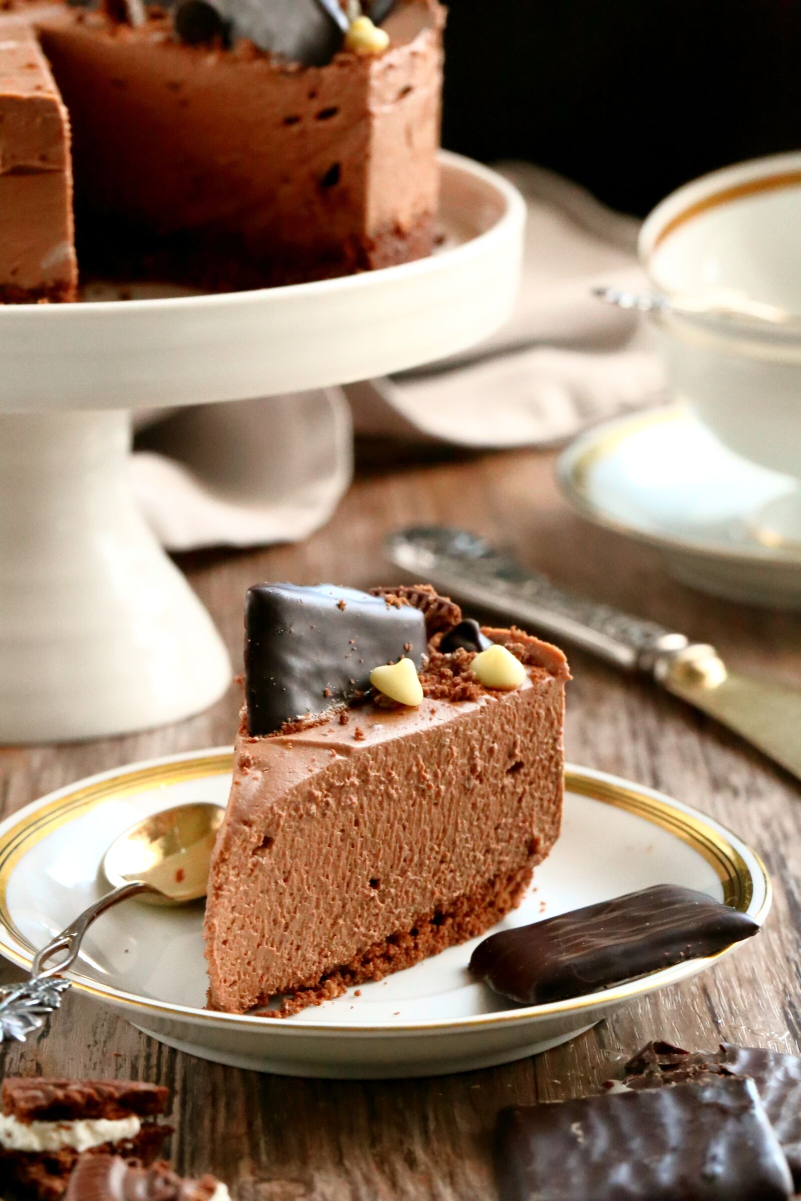 Myös vietävän hyvä After Eight -juustokakku valmistuu ilman liivatetta. Kakun maku suklainen ja minttuisen raikas. Koska kakku hyytyy ainoastaan suklaan (ja kunnolla vatkatun kerman) voimin, on sen koostumus ihanan pehmeä.