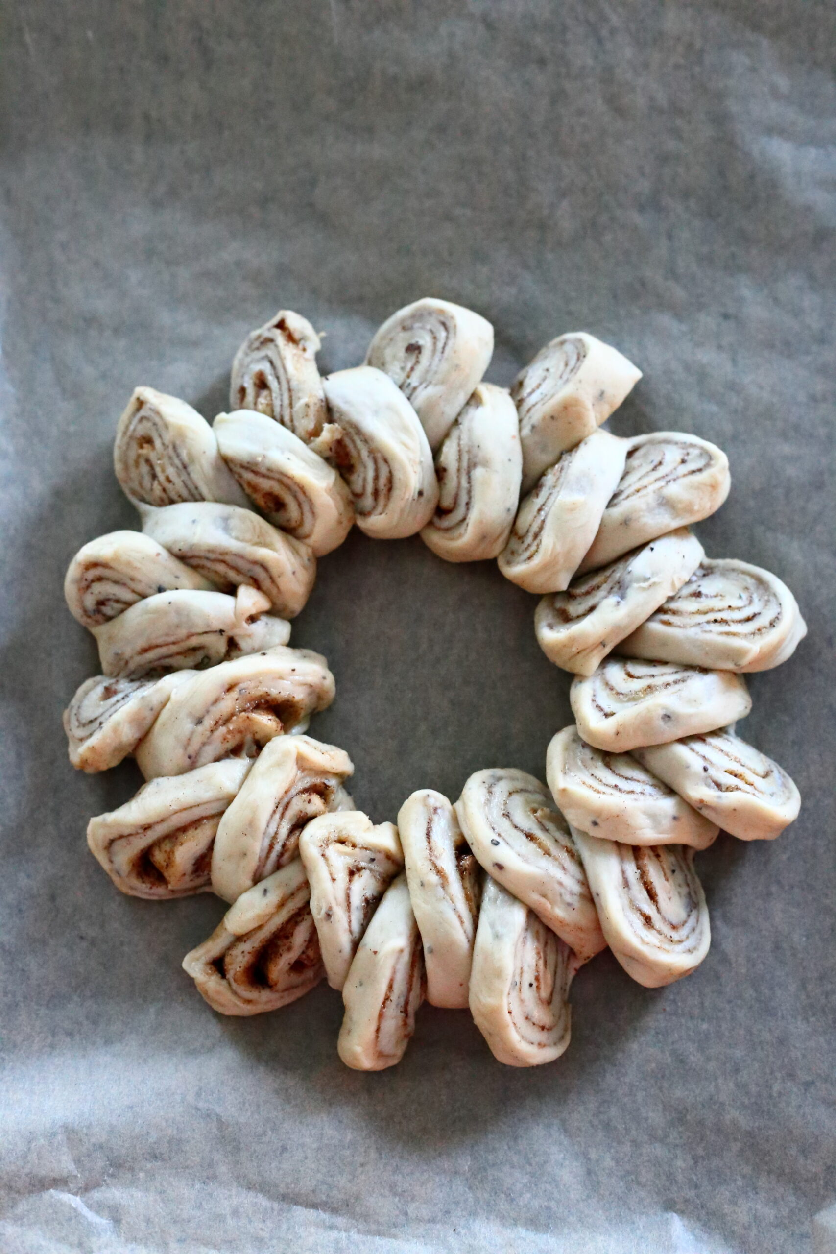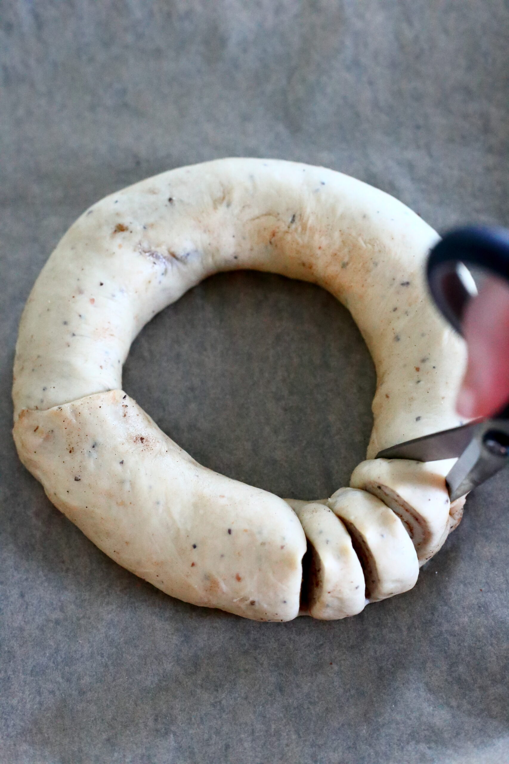 Pullakranssia varten: Nosta rullattu pullataikina uunipellillä olevan leivinpaperin päälle. Muotoile rullasta ympyrä ja yhdistä rullan alku- ja loppupää. Leikkaa saksilla pullataikinaa noin 2 sentin välein, mutta älä aivan alas asti.