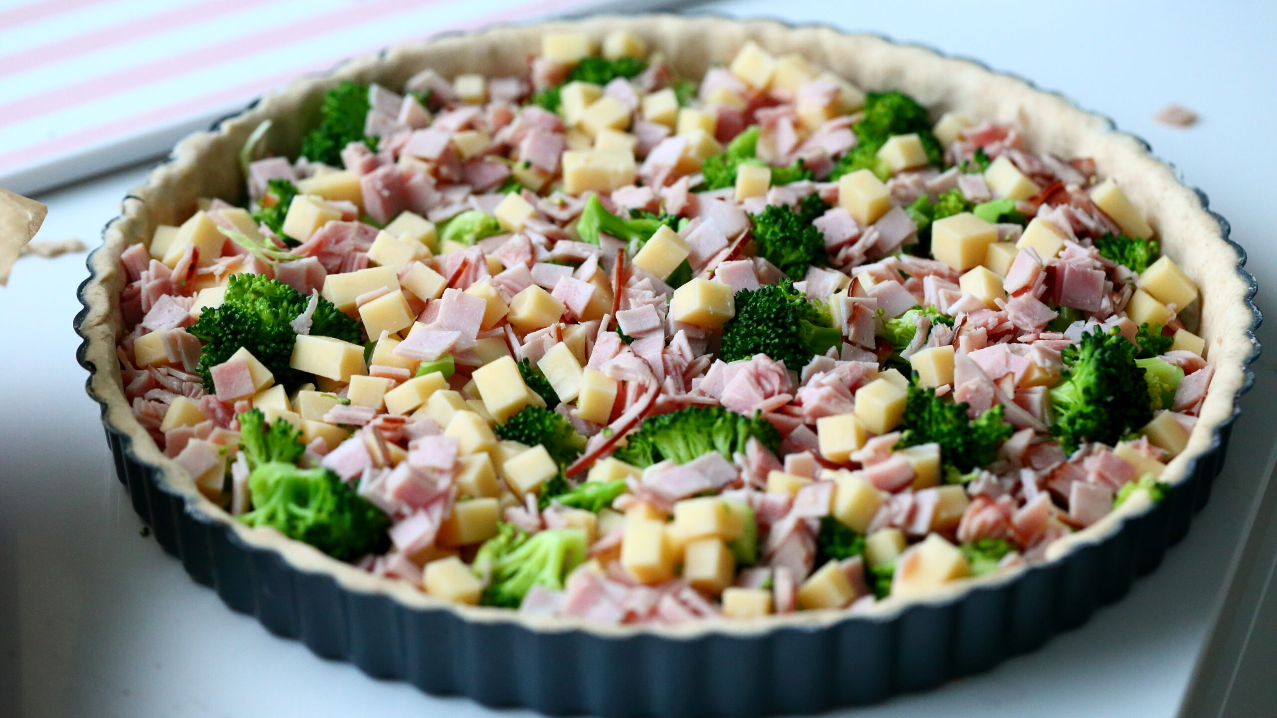 Nosta pelti/vuoka pois jääkaapista, ripottele päälle parsakaalin palat, juustokuutiot ja kuutioitu kinkku. Kaada päälle liemi.