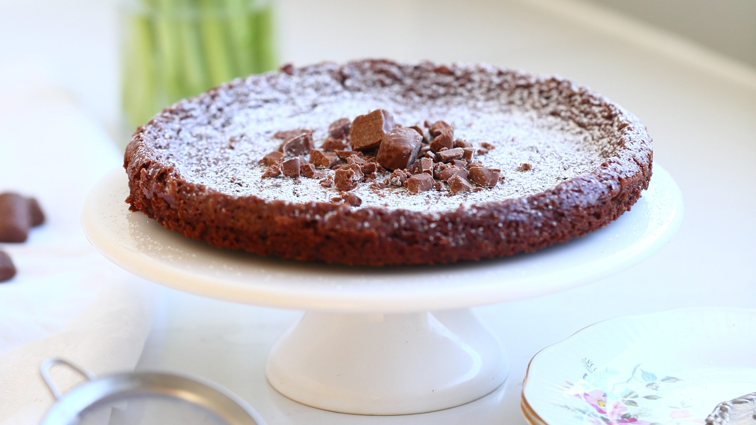 Paista mutakakkua 175 asteessa noin 18 minuuttia tai kunnes mutakakku on pullistunut kauttaaltaan, reunoilta kypsän oloinen, mutta höllyy keskeltä vielä vuokaa heiluttaessa. Nosta vuoka pöydälle ja jäähdytä ainakin muutama hetki ennen korkaamista. Kakku on hyvää myös huoneenlämpöisenä.