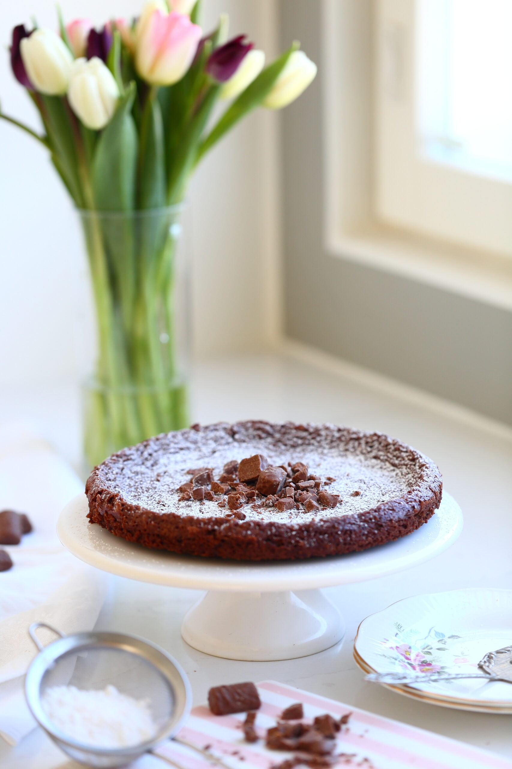 * Kuvissa näkyvä kakku on paistettu halkaisijaltaan 20 cm vuoassa. Vuoka oli aika suuri tuohon taikinamäärään, joten suosittelen käyttämään hieman pienempää vuokaa, jos haluaa mutakakusta edes hippasen paksumman. Huomaa, että vuoan vaihtaminen pienempään saattaa vaikuttaa paistoaikaan. Toisaalta tällaista isompaa mutakakkua ei tule otettua kovin isoa palaa kerrallaan ja pienikin pala vie pahimman suklaannälän…
