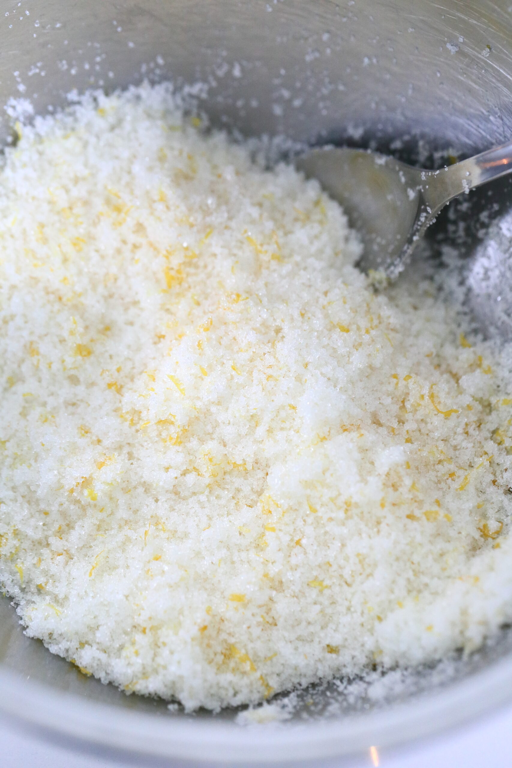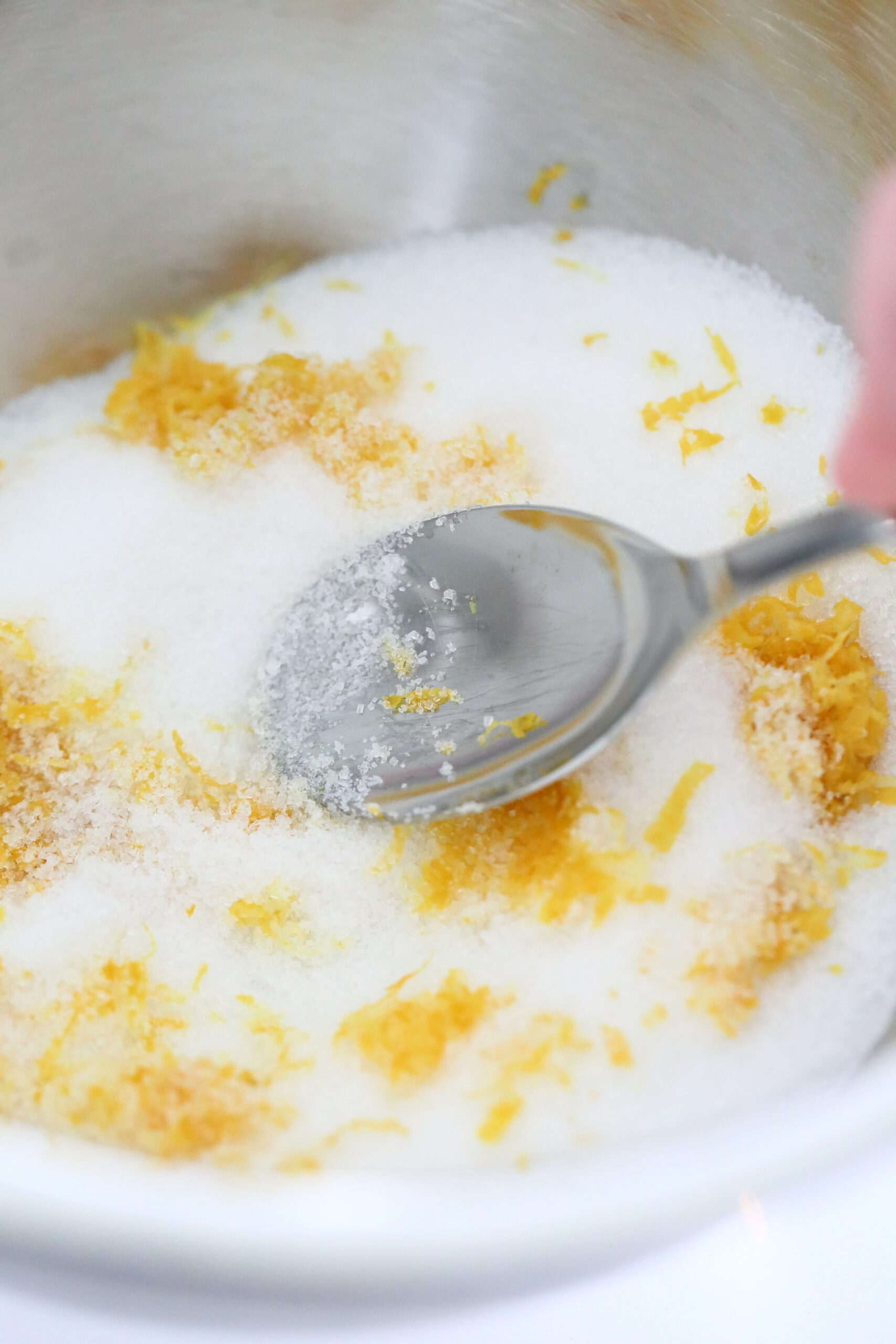 Pese sitruunat kunnolla. Raasta kahden sitruunan uloimmat, keltaiset kuoret hienolla raastimella. Mittaa leivontakulhoon sokeri ja sitruunan raastettu kuori. Hiero sitruunan kuoriraaste sokerin joukkoon. (Olen lukenut, että näin tehden sitruunan aromit irtoavat raasteesta kunnolla).