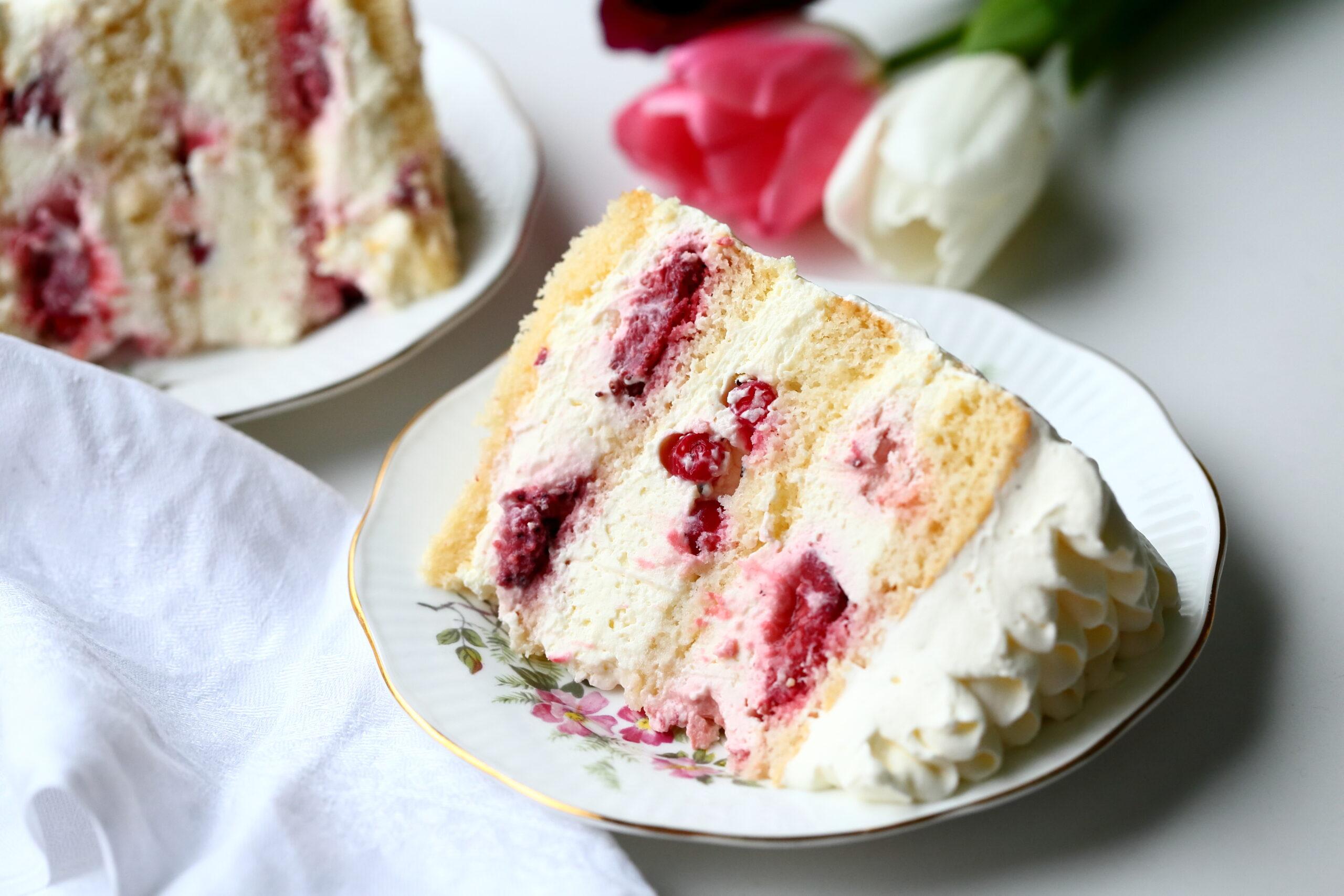* Valkosuklaamousse sopii moniin erilaisiin kakkuihin miedon makean makunsa takia. Kirpsakat marjat sopivat sen kaveriksi todella hyvin. Sopiva marjamäärä riippuu omasta mausta. Itse laitoin tähän kakkuun noin 100 g mansikoita/täyteväli ja punaherukoita pari kourallista.