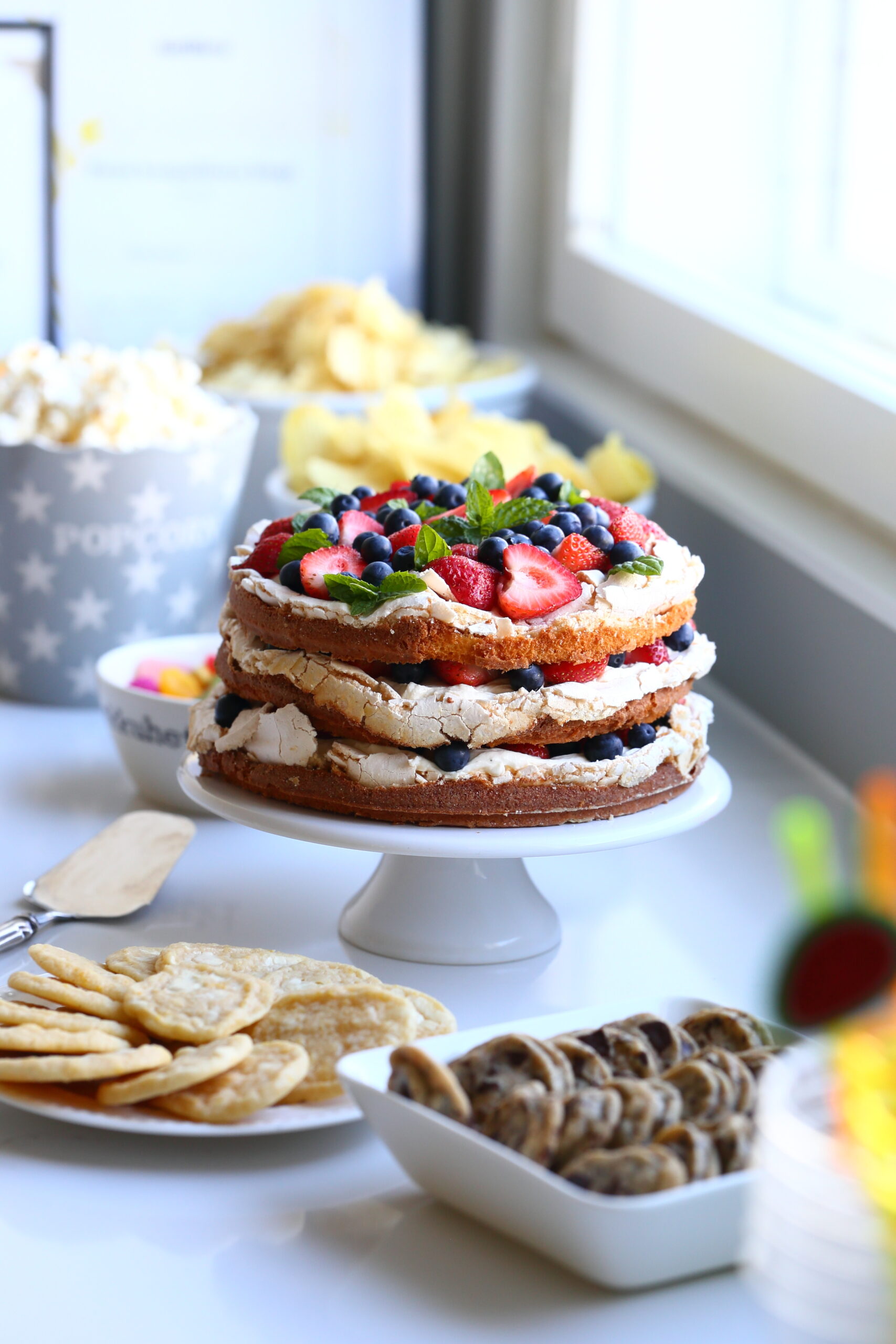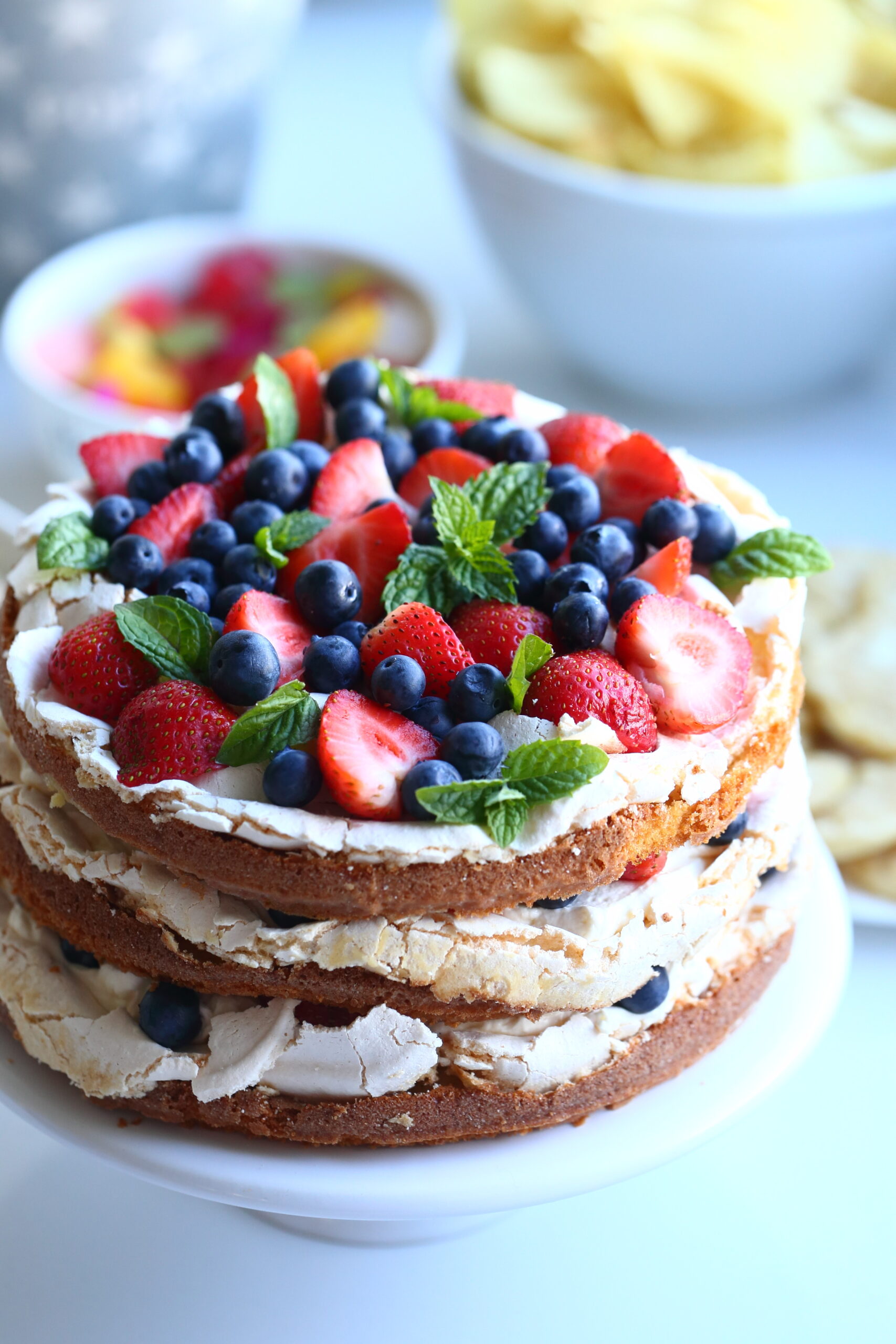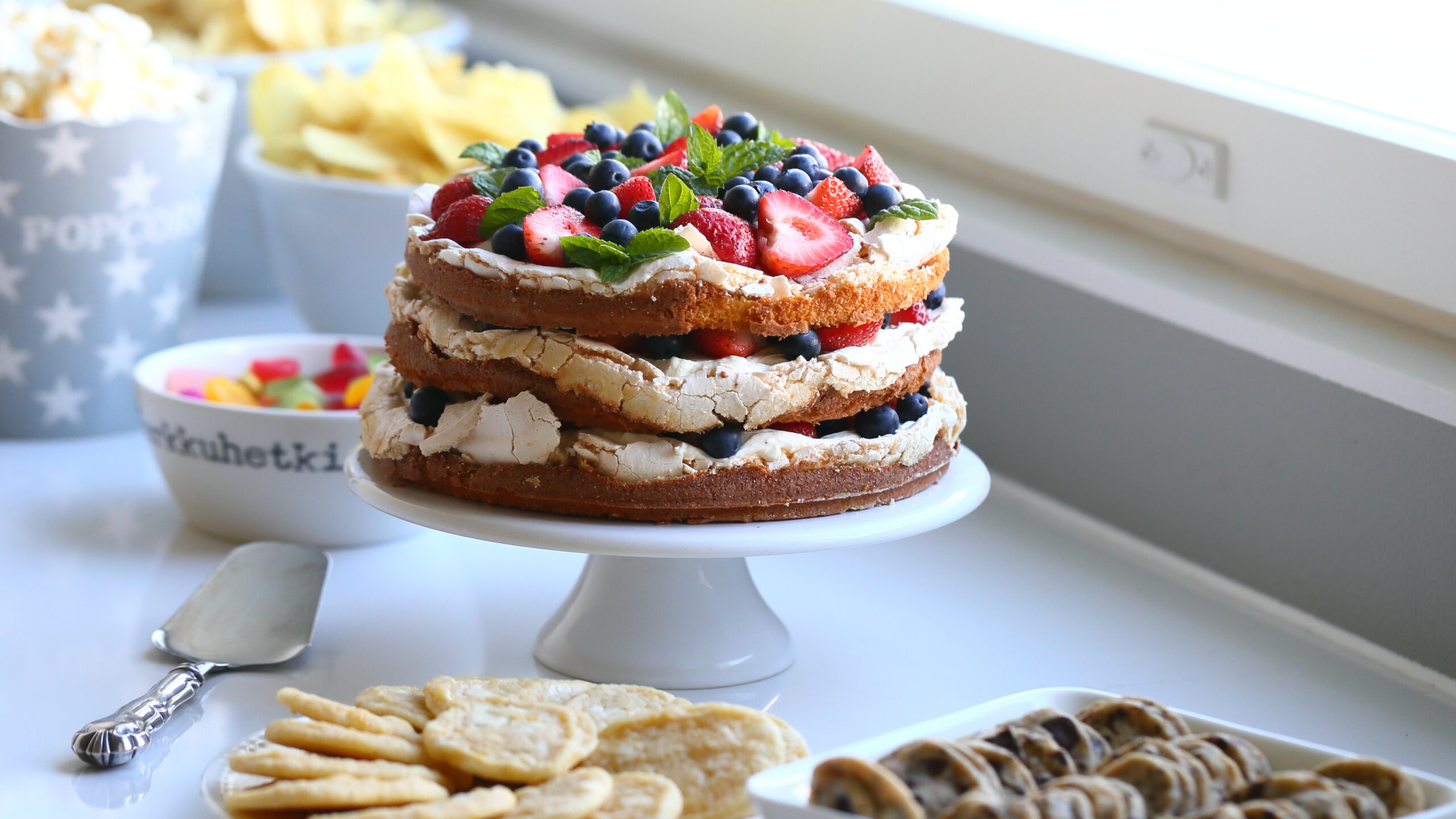 Tämä herkullinen, mansikoita ja pensasmustikoita sisältävä britakakku ihastutti tyttäremme kaverisynttärijuhlissa. Sekä minut, tyttären että tytön kavereitakin. Makea britakakkupohja, raikkaat tuoreet mansikat ja pensasmustikat sekä täyteläinen mascarponevaahto maistuivat vaan niin ihanilta yhdessä.