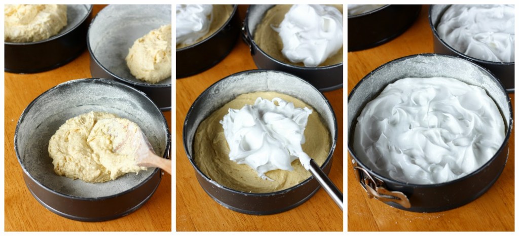 Voitele hyvin kolme n. 21 cm irtopohjavuokaa (TAI kolme hieman eri kokoista vuokaa, jolloin saat kakusta ylöpäin kapenevan). Jauhota vuoat esimerkiksi vehnäjauhoilla. Jaa pohjataikina vuokiin ja levitä tasaiseksi kerrokseksi vuokien pohjalle. Taikinaa ei tarvitse levittää aivan reunoihin asti, sillä taikina kyllä leviää uunissa. Laita vuoat syrjään odottamaan.