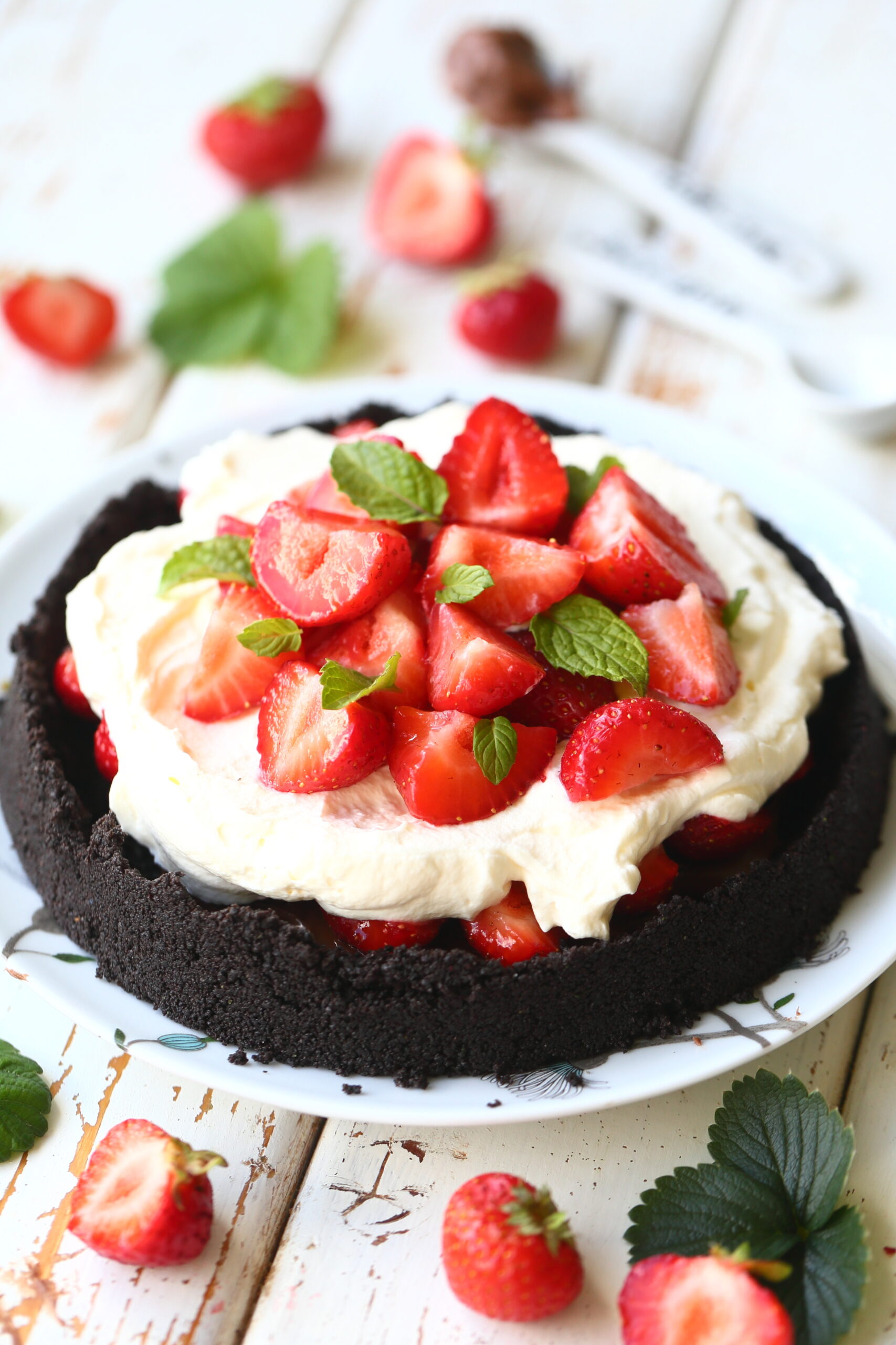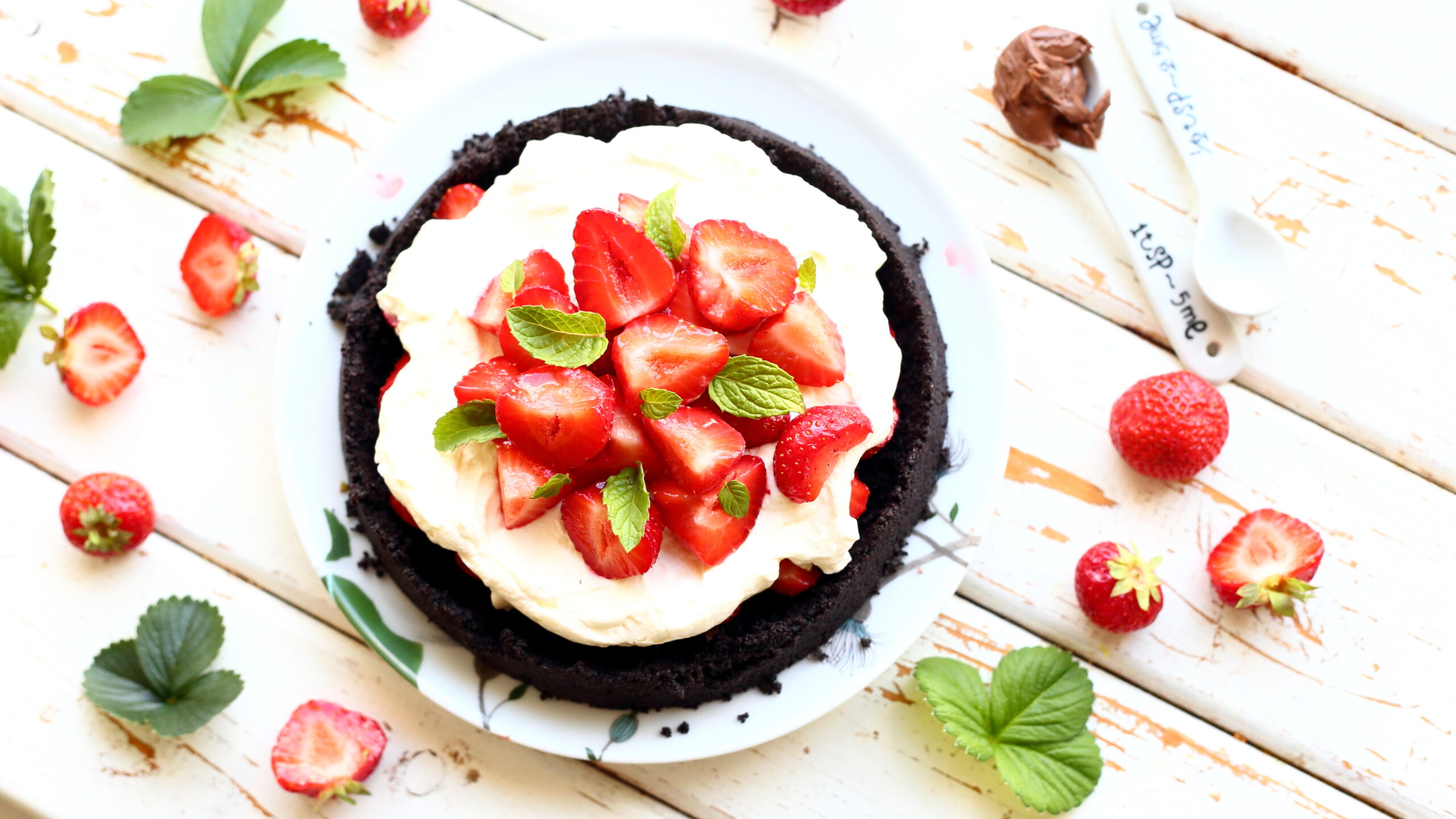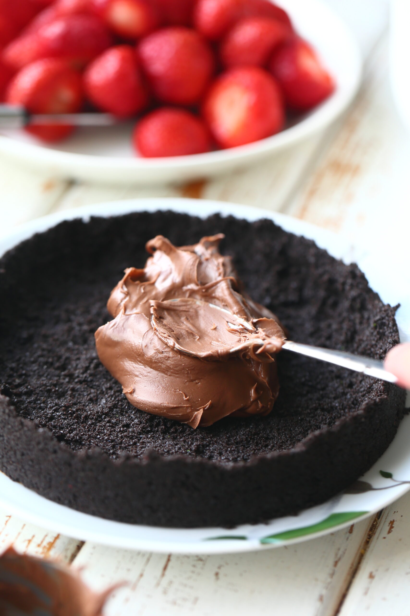 Poista mansikoita kannat ja puolita isoimmat mansikat. Vatkaa kerma vaahdoksi ja mausta pienellä määrällä vaniljasokeria. Nosta vuoka jääkaapista ja levitä sen päälle pähkinä-kaakaolevite, esimerkiksi Nutellaa.