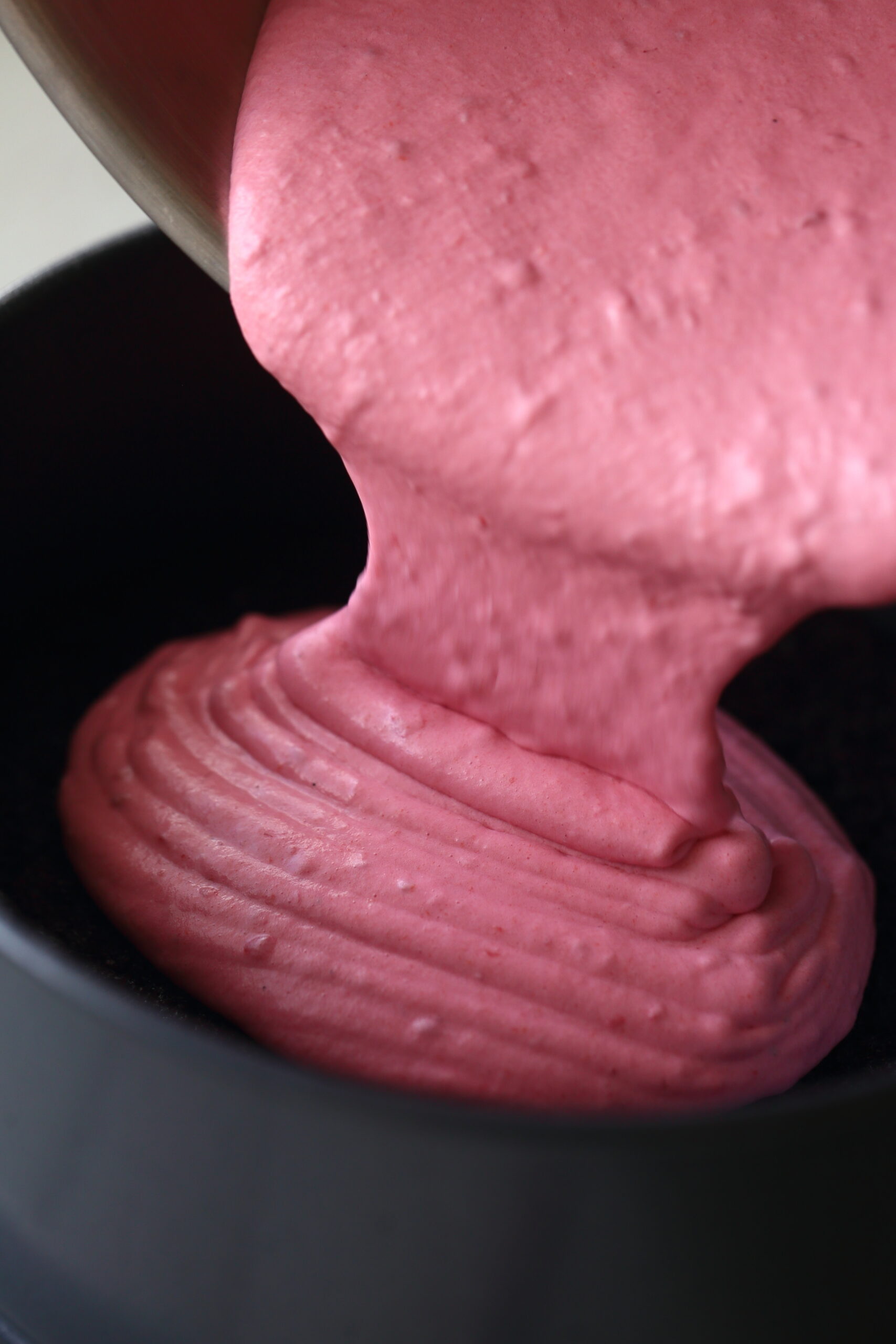 Tästä vadelmamoussekakusta tuli aivan ihanaa! Munattoman, suklaisen kakkupohjan päältä löytyy kerros pehmoista, kuohkeaa ja silkkisen sileää vadelmamoussea. Maistelin täytettä ennen vuokaan kaatamista ja voi nam! Huomasin jo tuossa vaiheessa, että täytteestä tuli yli-ihanaa!