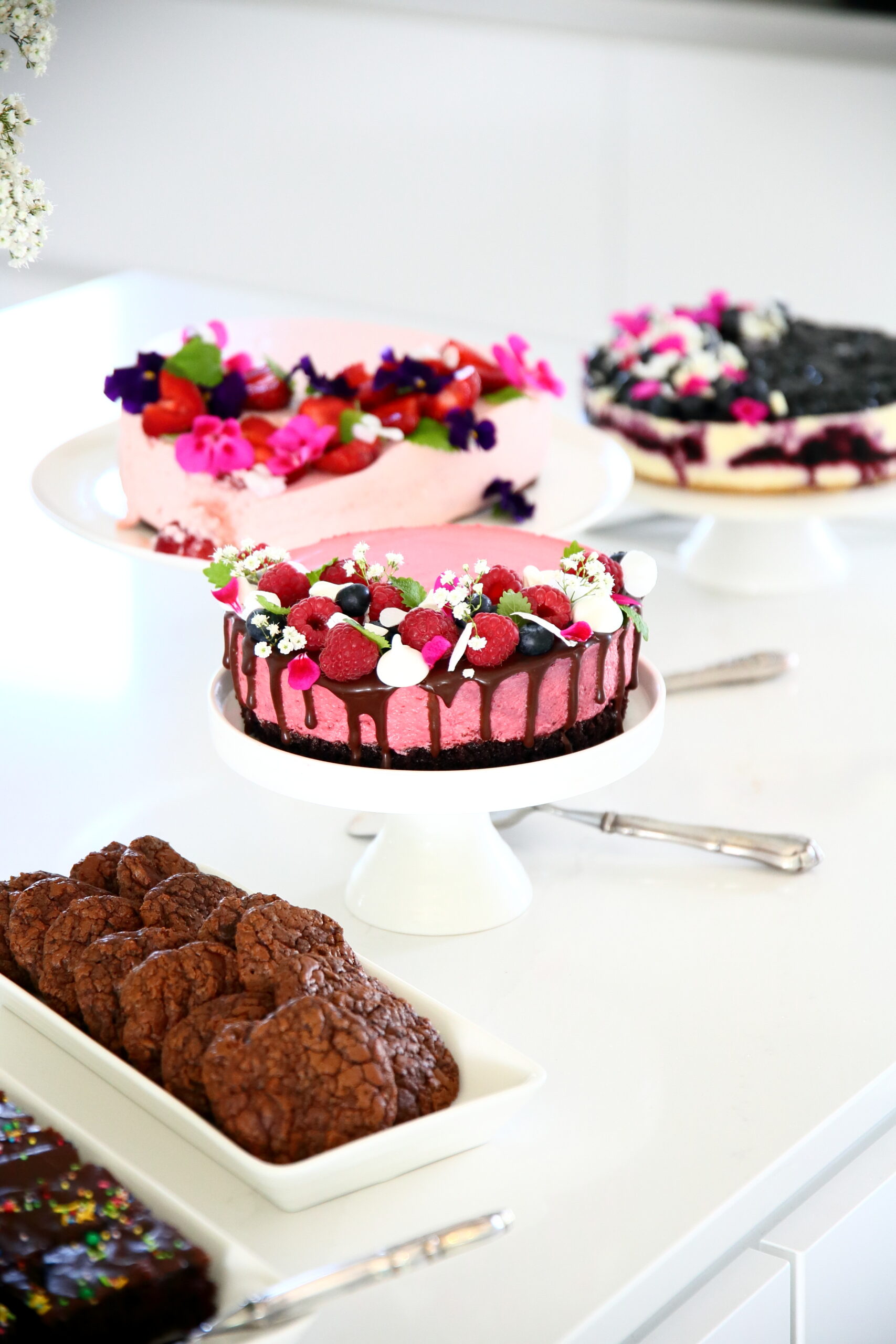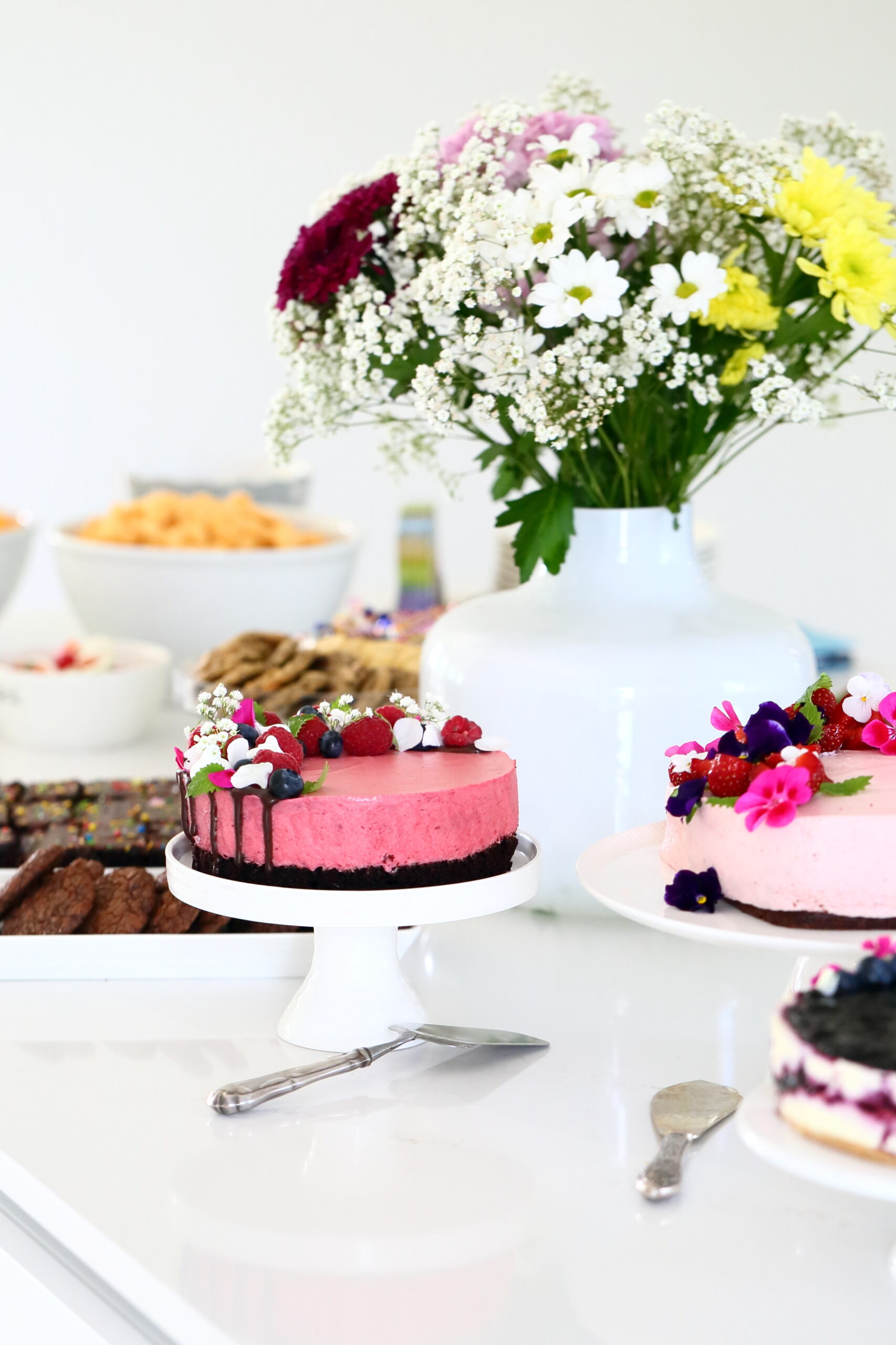 Koristele kakku vaikkapa tuoreilla marjoilla ja syötävillä kukilla. Ja eikun herkuttelemaan.