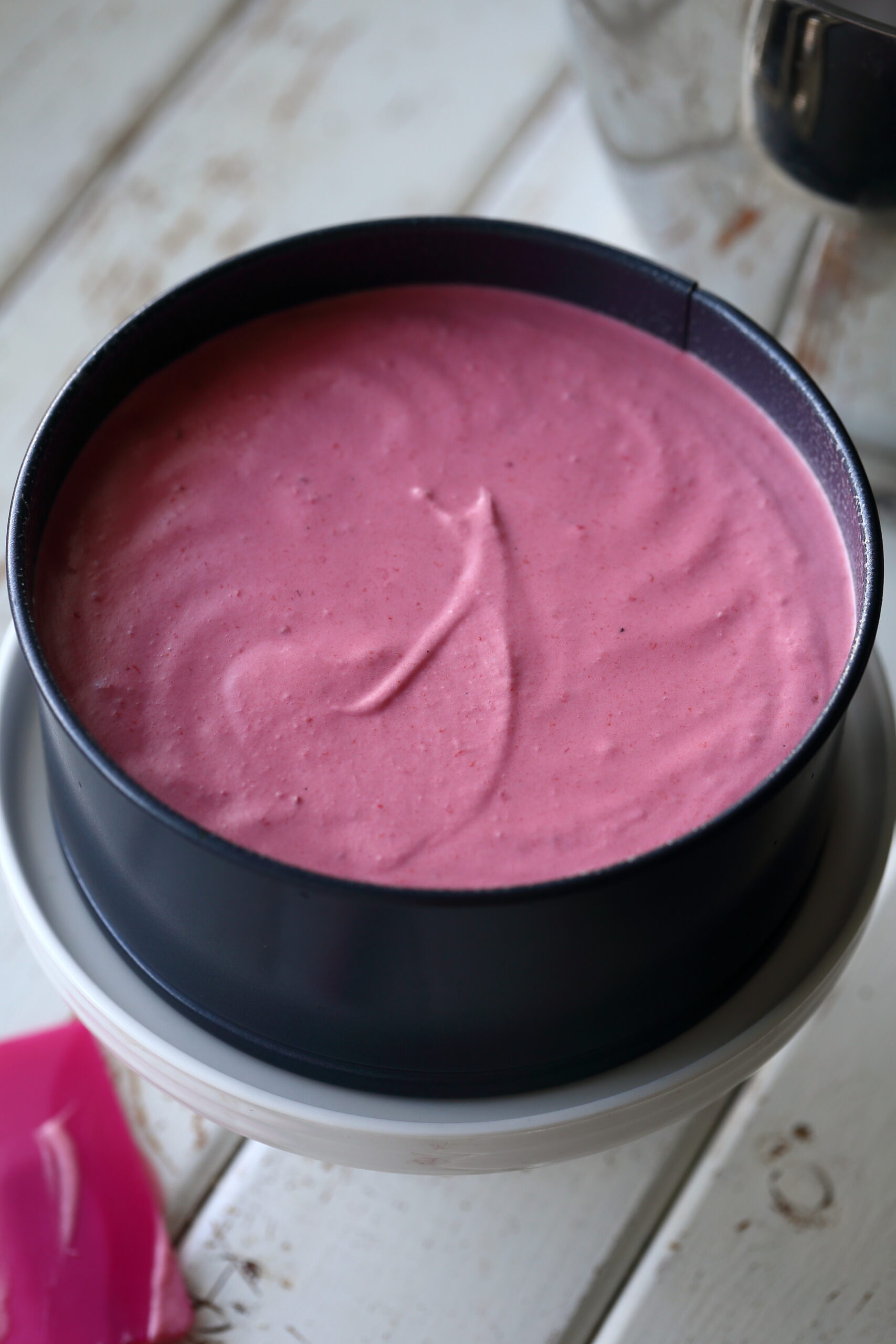 Lisää vadelmasose sveitsiläiseen marenkiin varovasti käännellen. Jos marenki ei meinaa sekoittua joukkoon, sekoita vähän rivakammin. Sekoitukseen sopii hyvin vispilä. Lisää lopuksi joukkoon vaahdotettu vispikerma mahdollisimman varovasti käännellen.