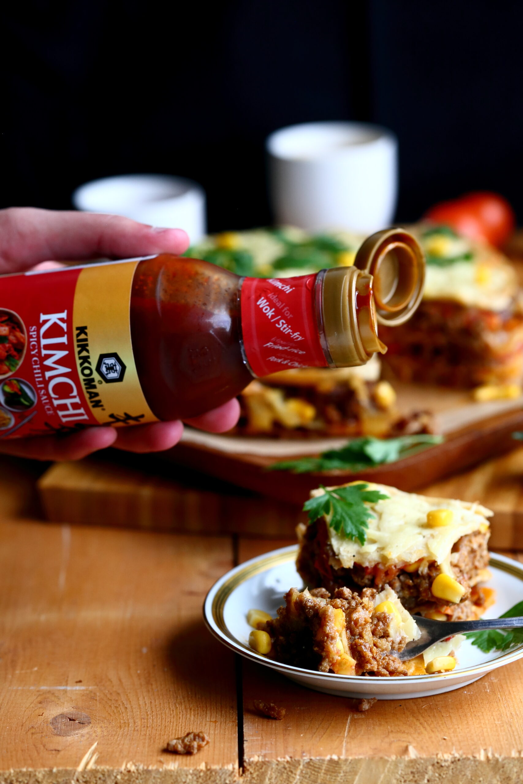 * Kikkomanin soijakastikkeet ovat kotiutuneet meille kunnolla kinuskikastikkeen testaamisen jälkeen. Voisinkin sanoa soijakastikkeen olevan nykyään yksi vakiomausteistamme. Kikkomanin tuoteperhe sisältää paljon muitakin tuotteita tavallisen soijakastikkeen ja tämän Ponzu Chilin lisäksi. Yksi niistä on tulinen Kikkoman Kimchi Chilikastike, jota lorautin testimielessä pienen määrän Texmex -piirakkani päälle tuomaan lisätulisuutta. Jos pienenä määränä se toi mukaan lisäpotkua, joten…