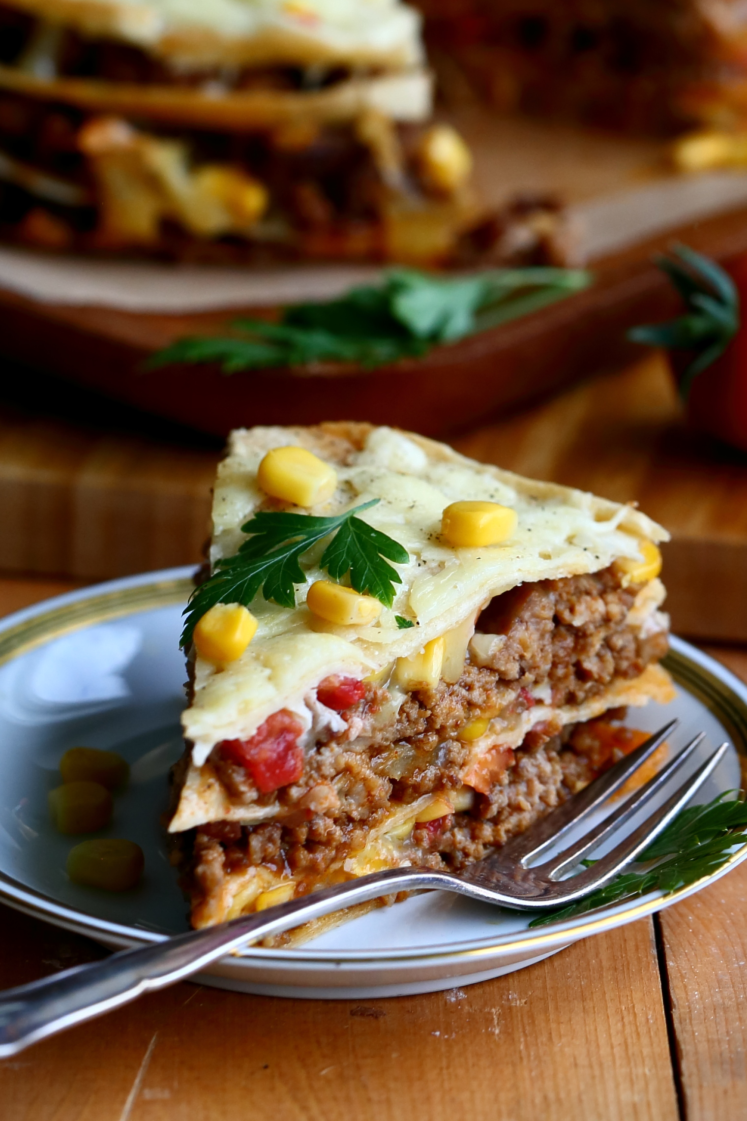 Piirakka oli hauskuuden lisäksi helppo tehdä. Piirakasta löytyy kerroksittain texmex-tyyliin maustettua jauhelihaa, maissia, tomaattia ja juustoraastetta sekä tortillapohjia, Käytin täytekerrosten erottamiseen valmiita tortillapohjia, mutta tortillat voi halutessaan tehdä myös itse.
