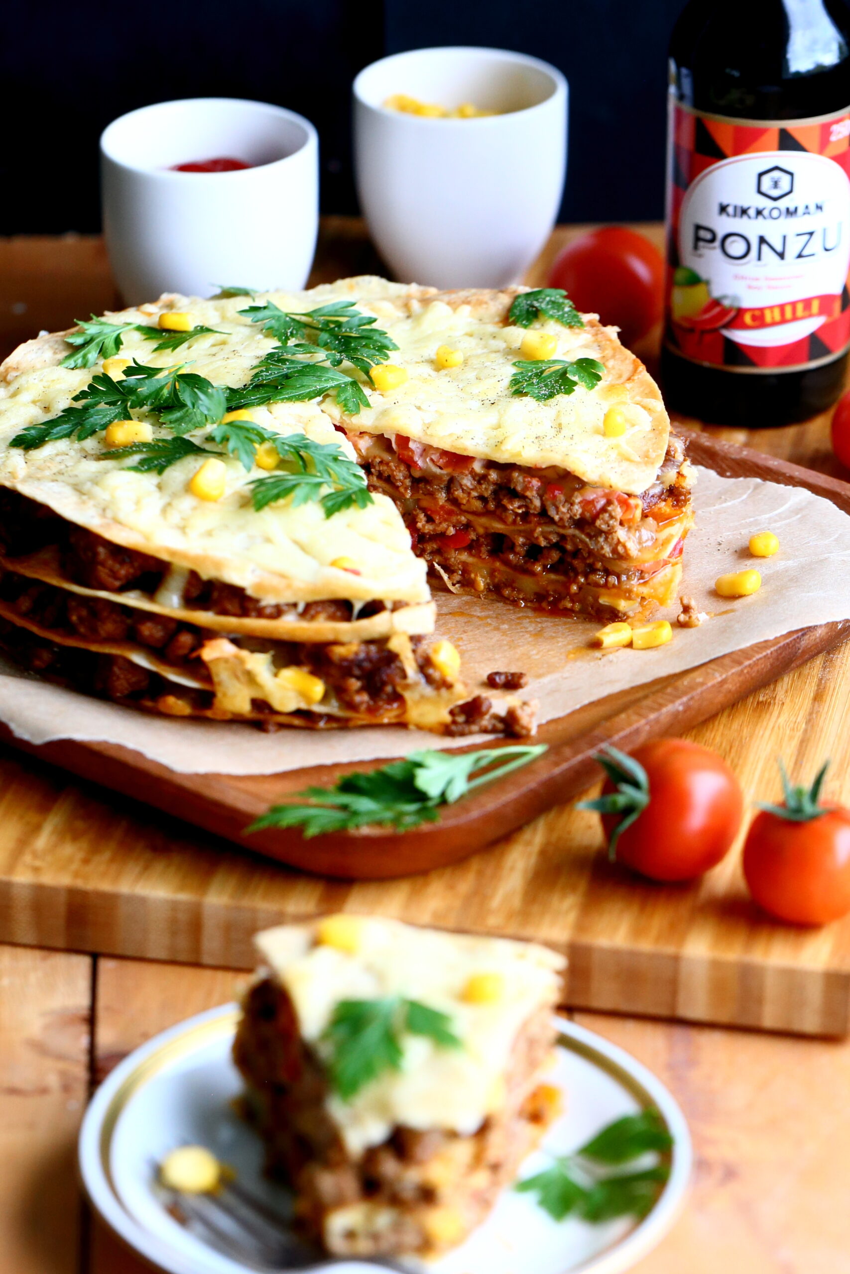 Lempimausteillamme sekä Kikkoman Ponzu Chilillä maustettu jauhelihatäyte maissin ja tomaattien kanssa pysyy kasassa tortillalevyjen välissä juustoraasteen avulla. Vielä kun piirakan kokoaa irtopohjavuokaan, voi täytteet ujuttaa reunoille asti ilman pelkoa siitä, että täytteet holahtavat välistä pois paistamisen aikana.