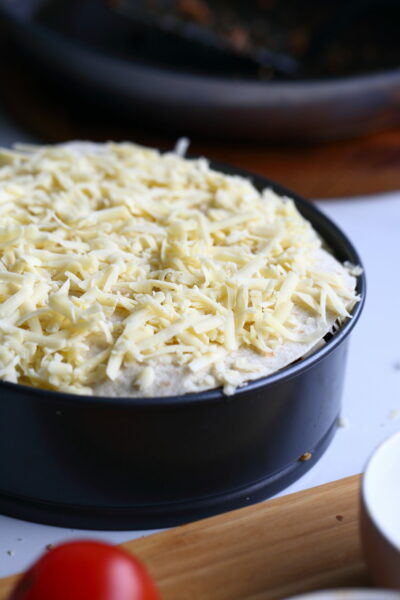 Voitele halkaisijaltaan noin 20 cm kokoisen (tai tortillan kokoisen, jos tortilla jonkun muun kokoinen) irtopohjavuoan sisäpuoli. Laita vuoan pohjalle yksi tortilla. Levitä pinnalle tasaiseksi kerrokseksi noin kolmannes jauhelihaseoksesta. Ripottele päälle puoli desiä maissia ja pari lusikallista tomaattia.
