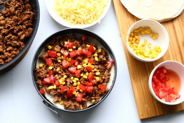 Lisää päälle toinen tortilla ja lisää puolet jäljellä olevasta jauhelihasta, maissia ja tomaattia sekä kolmannes jäljellä olevasta juustoraasteesta. Toista vielä kerran kolmannen tortillan kanssa ja loppujen täytteiden kanssa (jätä päälle vielä juustoraastetta). Nosta päällimmäiseksi viimeinen tortilla ja ripottele päälle loput juustoraasteesta.