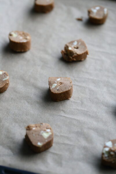 Laita uuni lämpeämään 150 asteeseen. Leikkaa kumpikin jäätynyt pötkö 12 yhtä suureen osaan. Nosta 12 palaa yhdelle leivinpaperilla vuoratulle uunipellille.
