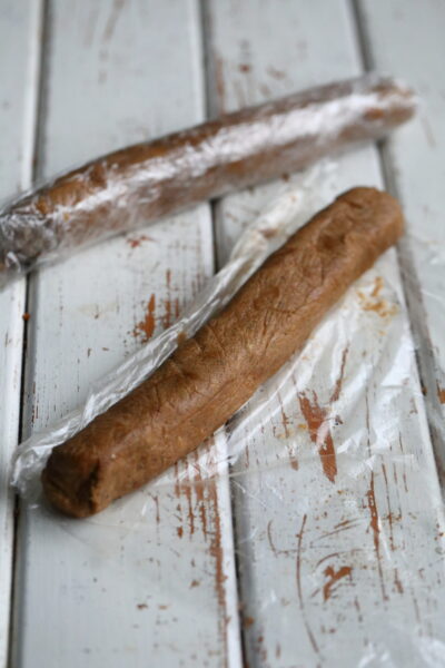 Tee taikinasta kaksi noin 25-27 cm pituista pötköä ja kääri ne kelmuun.