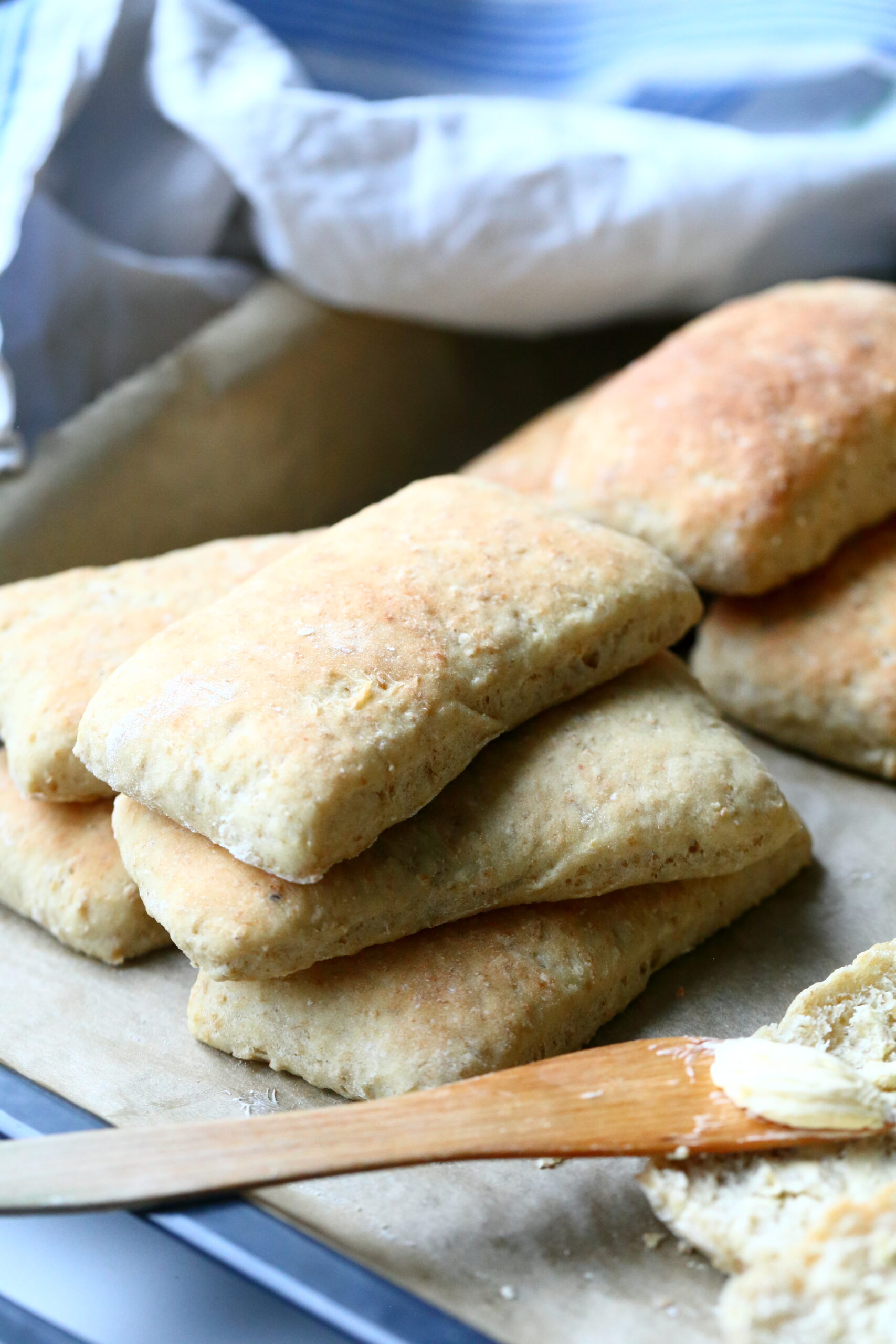 Nosta palat uunipelleille leivinpaperien päälle ja peitä liinalla. Anna kohota lämpimässä paikassa vähintään 45-60 minuuttia tai kunnes taikina on noussut kaksinkertaiseksi.