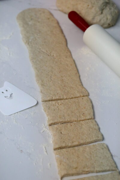1.) Jos haluat pullukampia leipiä, painele kumpikin taikina noin 60 cm x 10 cm kokoiseksi pitkulaiseksi levyksi ja leikkaa kumpikin 9 osaan.