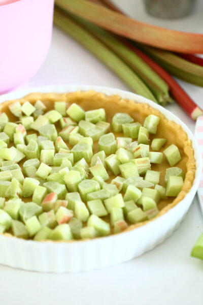 Pilko raparperit pienemmiksi paloiksi. Sekoita joukkoon maissitärkkelysjauhoja ja ripottele raparit pohjan päälle tasaiseksi kerrokseksi.