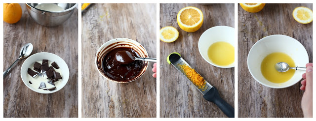 Laita pilkottu suklaa ja 1 dl vispikermaa mikron kestävään kulhoon. Lämmitä mikrossa n. 10-15 sekunnin jaksoissa välillä sekoitellen, kunnes suklaa on kokonaan sulanut. Jätä hetkeksi sivuun jäähtymään. Pese appelsiinin kuori todella hyvin ja raasta se hienolla terällä. Muista raastaa vain kuoren uloin, keltainen osa, sillä valkoinen osa on karvasta. Purista appelsiinin mehua 1.5 rkl mikron kestävään pieneen kippoon. Sekoita liivatejauhe appelsiinin mehuun ja anna turvota. (Jos käytät liivatelehtiä, laita ne turpoamaan kylmään veteen. Kun ne ovat turvonneet, kuumenna appelsiinin mehu ja liuota lehdet siihen.)