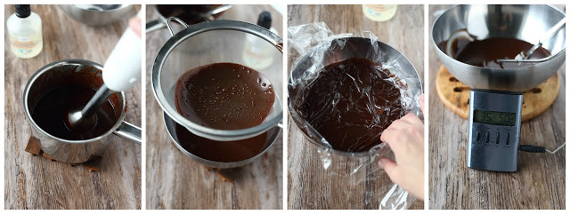 Vatkaa seosta sauvasekoittimella, kunnes se on sileää ja kiiltävää. Pidä sauvasekoitin koko ajan pinnan alla, varo vatkaamasta joukkoon ilmakuplia. Siivilöi seos tiheän siivilän läpi. Näin saat mahdolliset ilmakuplat pois. Laita kelmun pala ihan kuorrutteeseen kiinni jäähtymisen ajaksi, jotta pintaan ei tule kuorta. Tähtää 35-36 asteeseen. Jos et omista mittaria, on kiille valmis, kun se on aavistuksen ihoa viileämpi, edelleen juoksevaa, mutta kiinteytynyt aavistuksen.
