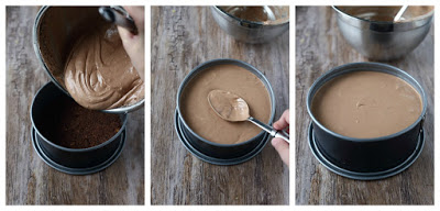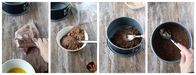 Ohje: Tee kakkupohja murskaamalla keksit esim. pakastepussissa käsin painellen. Sekoita joukkoon kaakaojauhe sekä sokeri. Sulata voi mikrossa ja sekoita joukkoon keksin murut. Voitele n. 16 cm irtopohja vuoan pohja kunnolla esim. vuokaspraylla. Painele keksiseos vuoan pohjalle kunnolla. Laita vuoka jääkaappiin täytteen teon ajaksi.